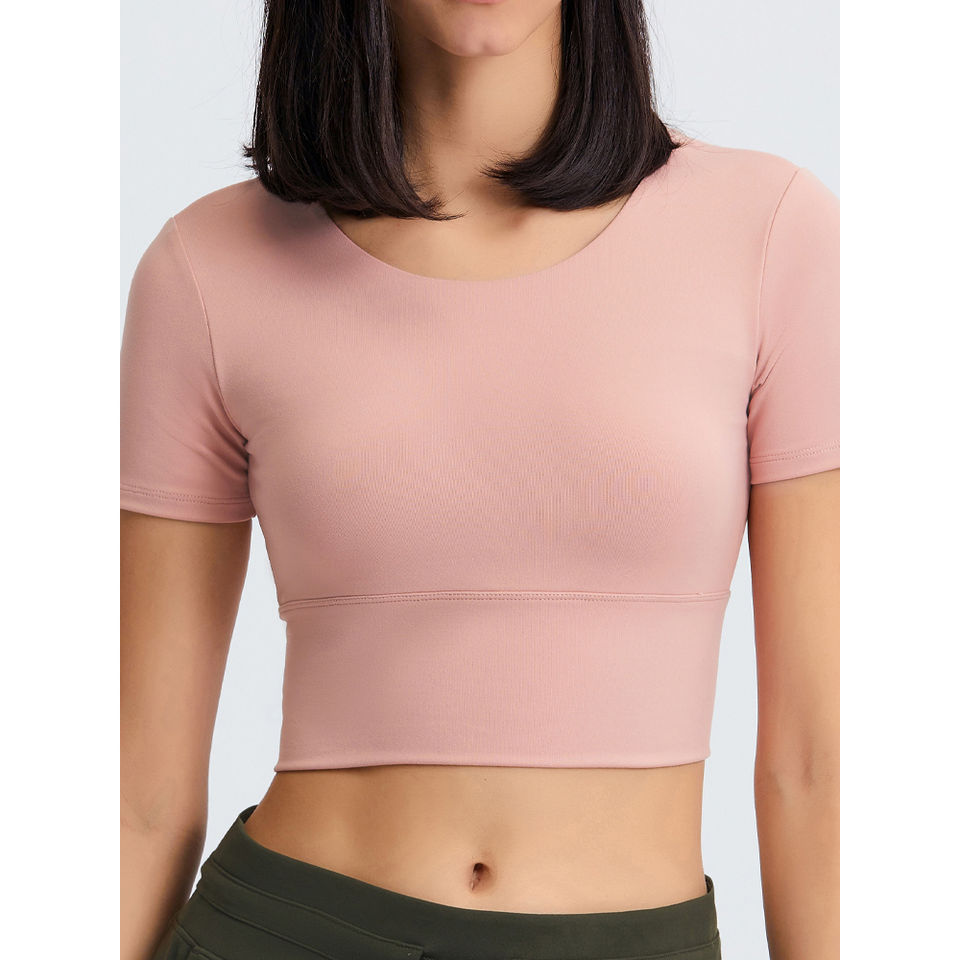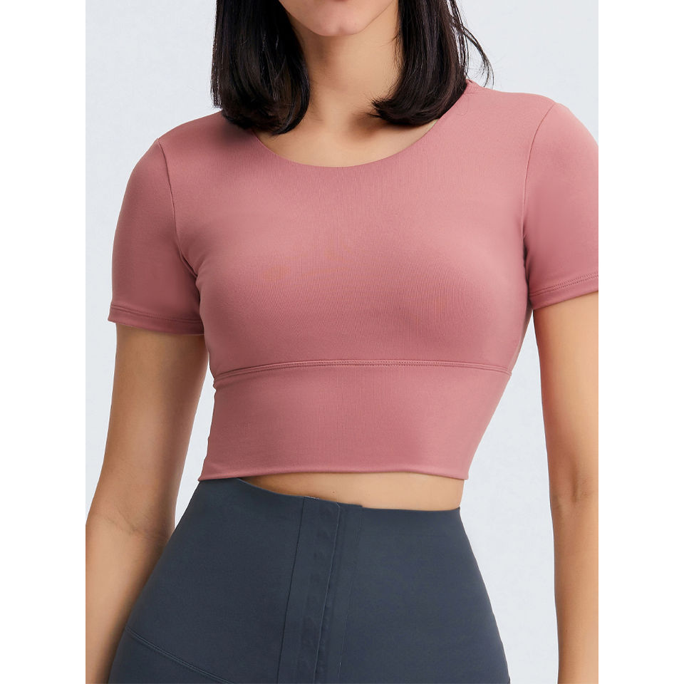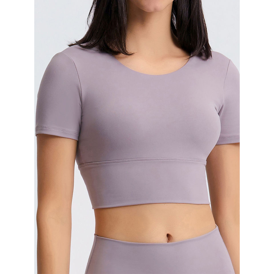 เสื้อครอปเปิดหลังสำหรับผู้หญิงเสื้อครอปเอวลอยทรงสปอร์ตเสื้อโยคะเปิดหลังไขว้ด้านหลังแขนสั้น