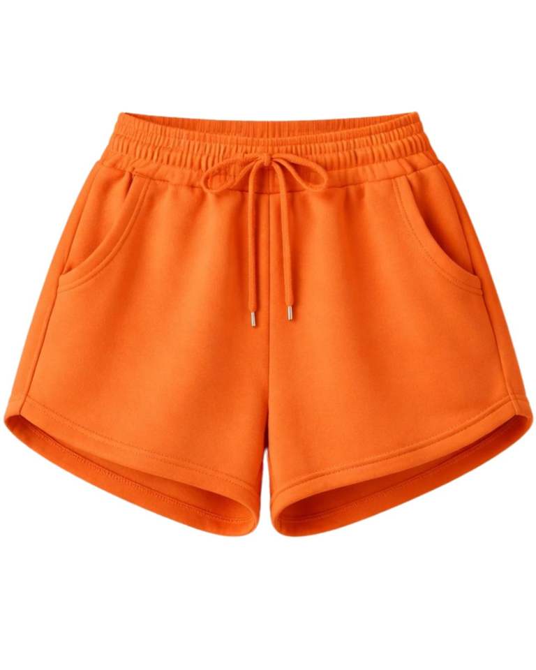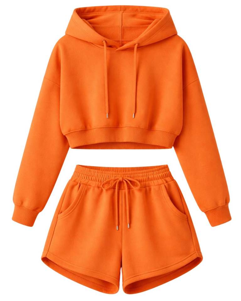 ชุดเซ็ตเสื้อครอปฮู้ดดี้สีส้มและกางเกงขาสั้นสำหรับผู้หญิง ดีไซน์เรียบง่าย สไตล์ลำลอง ชุดสองชิ้น ผ้าฝ้ายฟลีซ ชุดลำลองสำหรับพักผ่อน ขายส่งจากผู้ผลิต