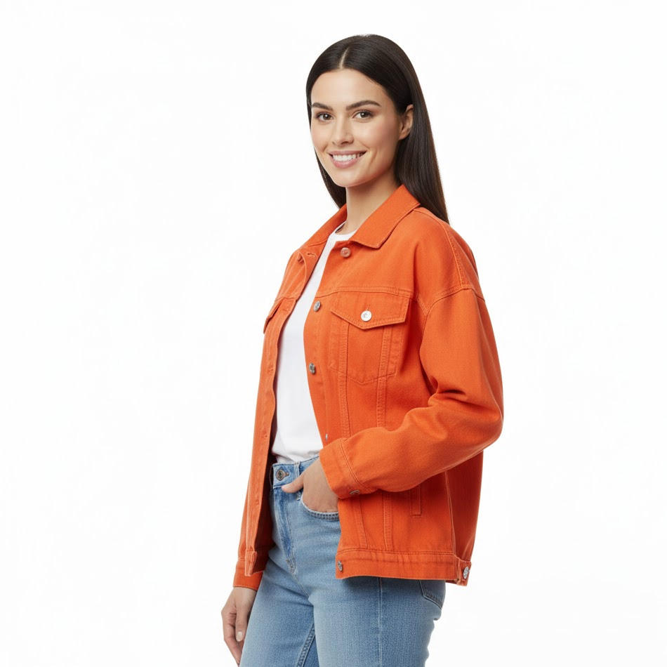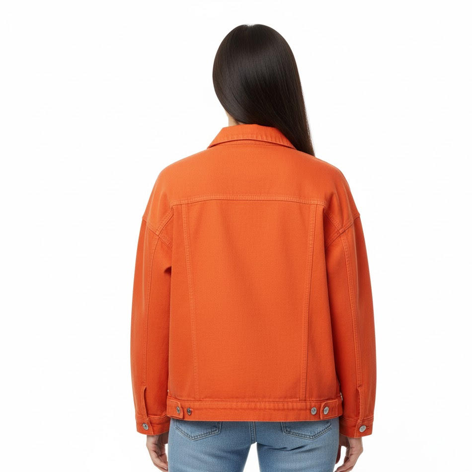 แจ็กเก็ตยีนส์ผ้าคอตตอนถักสีส้มสำหรับผู้หญิงแจ๊กเก็ตแฟชั่นแบบลำลอง
