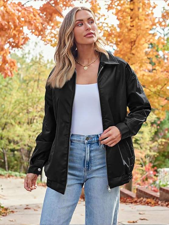 เสื้อแจ็คเก็ตมอเตอร์ไซค์หนังเทียมทรงโอเวอร์ไซส์สำหรับผู้หญิง ปิดด้วยซิป สไตล์พังก์สำหรับฤดูใบไม้ร่วง