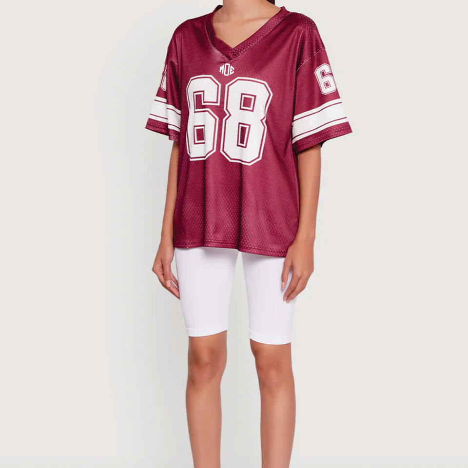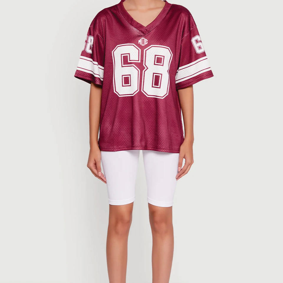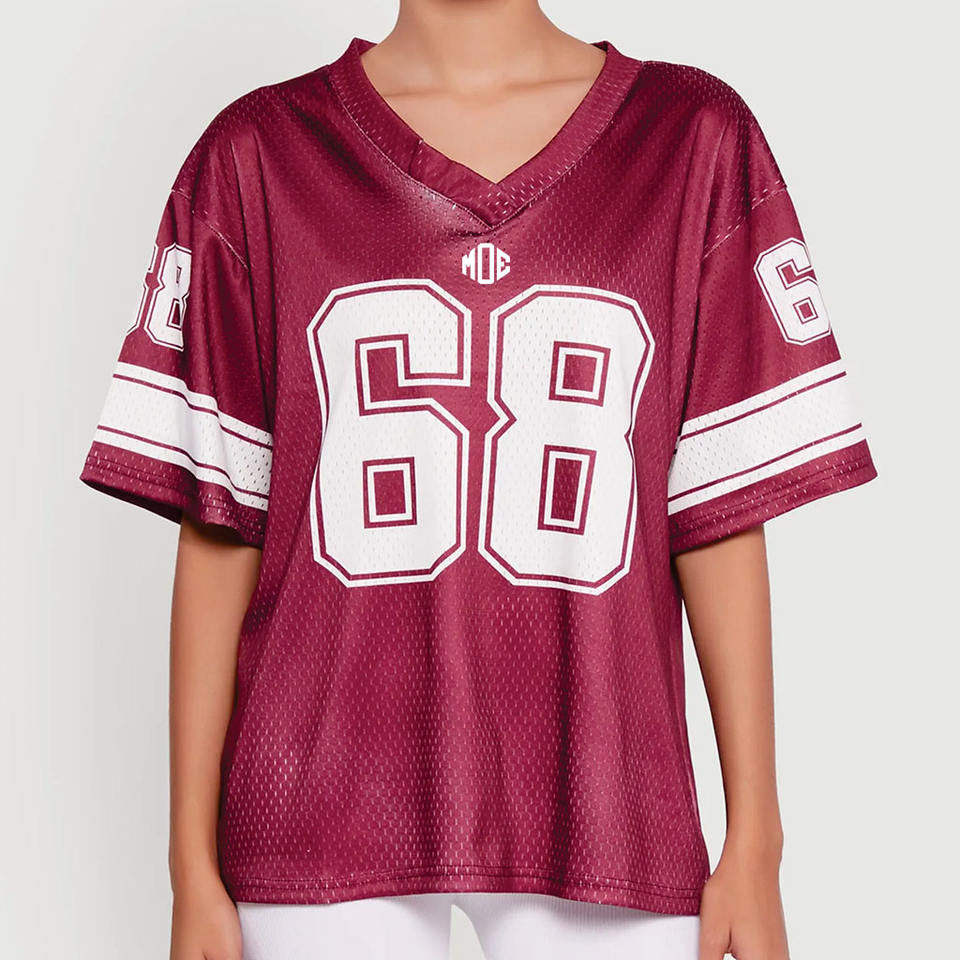 เสื้อเจอร์ซีย์อเมริกันฟุตบอลตาข่ายไซส์ใหญ่สำหรับผู้หญิง ระบายอากาศได้ดี ผลิตจากโพลีเอสเตอร์ คอวี เสื้อกีฬา สำหรับขายส่ง รับผลิตตามสั่งสำหรับทีม ผู้จัดจำหน่ายจากสหรัฐอเมริกา