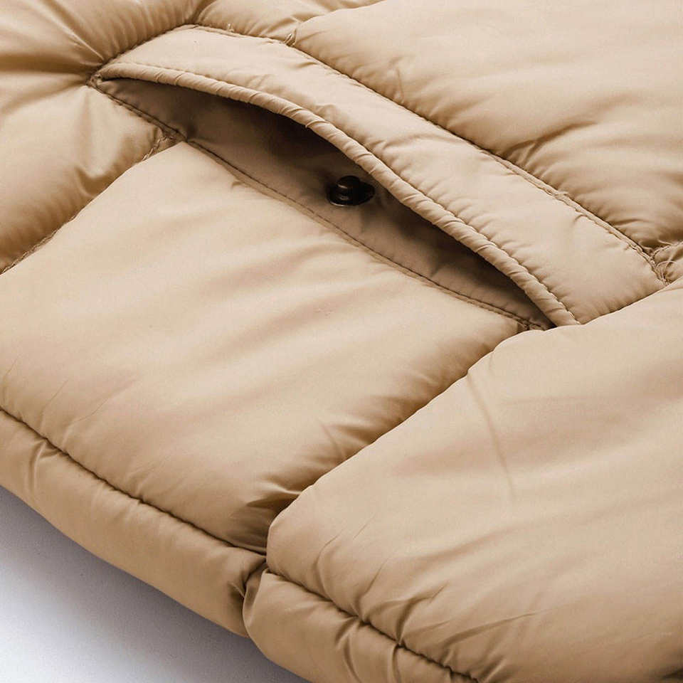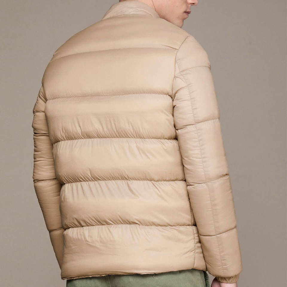 แจ็กเก็ตขนเป็ดไนลอนบุฟองน้ำสำหรับผู้หญิงสีเบจให้ความอบอุ่นในฤดูหนาวน้ำหนักเบามีซิปดีไซน์ซับเรียบใส่สบาย