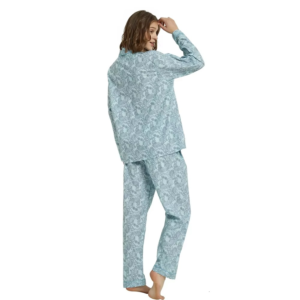 เซ็ตชุดนอนผ้าไหมสำหรับผู้หญิงชุดนอนชุดนอนแบบกระดุมปกคอเสื้อปักลายสีพื้น