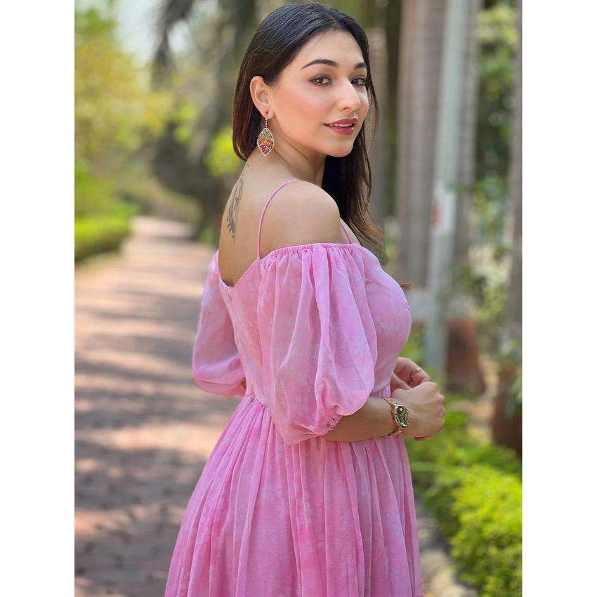 ชุดเดรสยาวสีชมพูแบบเปิดไหล่สำหรับผู้หญิง แต่งระบายเป็นชั้นๆ เหมาะสำหรับงานปาร์ตี้ฤดูร้อนและใส่ไปเที่ยวพักผ่อน