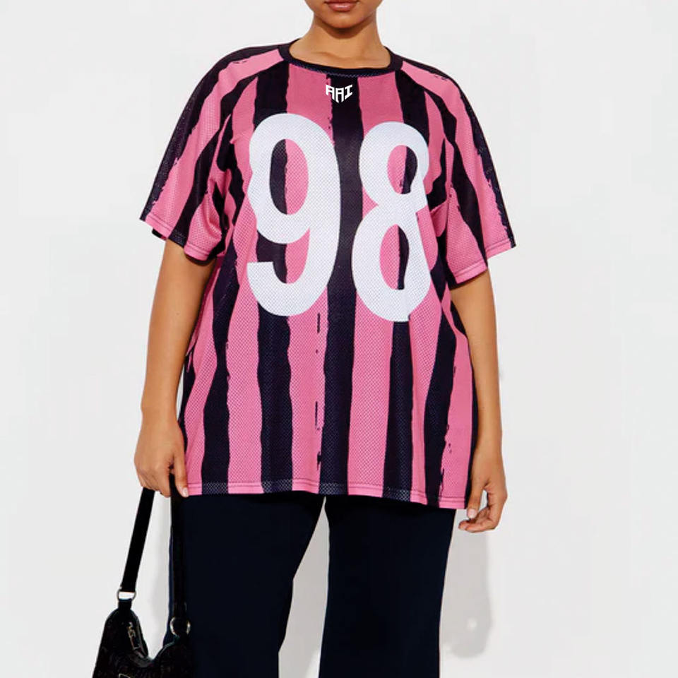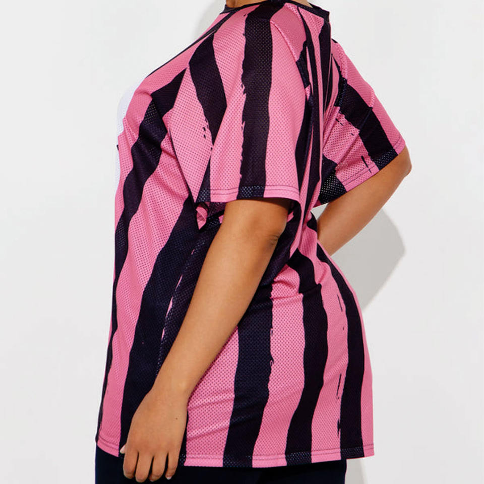 เสื้อเจอร์ซีย์อเมริกันฟุตบอลผู้หญิงสีชมพูลายทางผ้าตาข่ายทรงโอเวอร์ไซส์ สตรีทแวร์ เสื้อกีฬา สั่งทำหมายเลขได้ ชุดทีม ผลิตโดยโรงงาน OEM รับออเดอร์จำนวนมาก