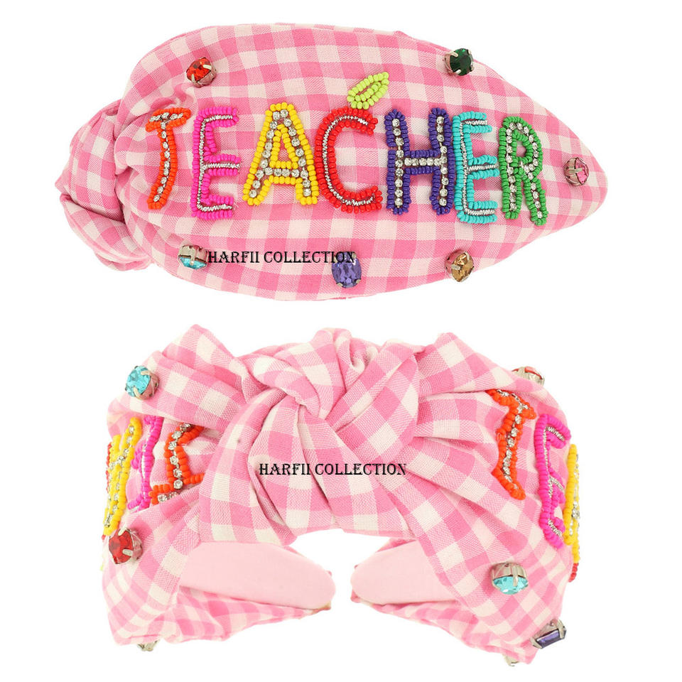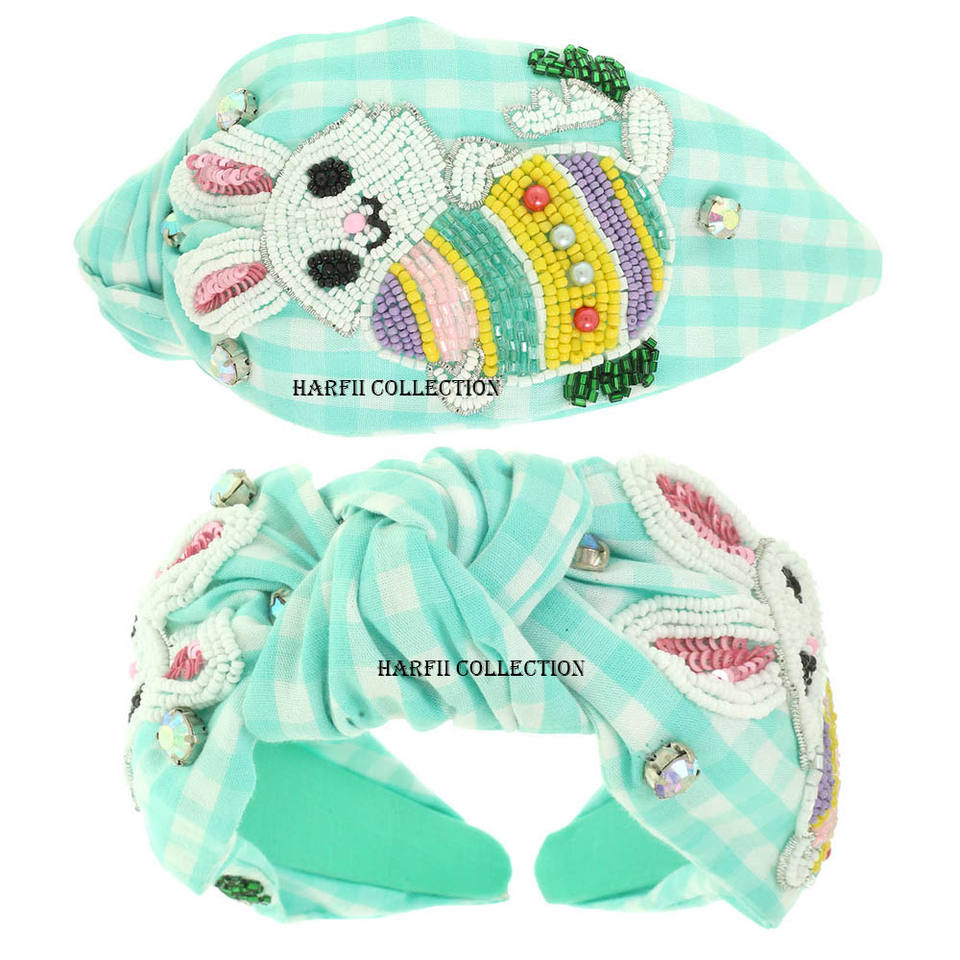 Women Plaid Knot Headband with Handmade Beaded Mug Lipstick Flower Detail Trendy Fabric Hair Accessory