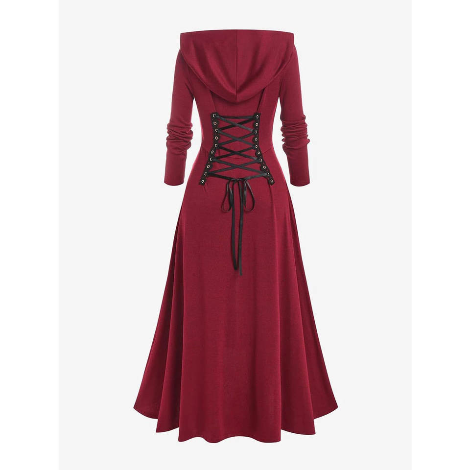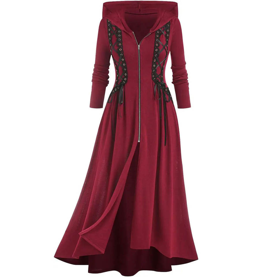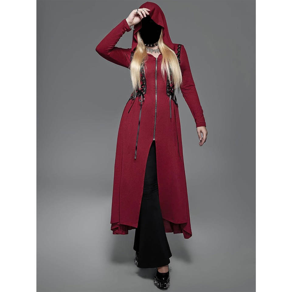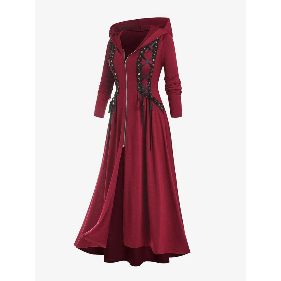 เสื้อโค้ทยาวทรงโกธิคสำหรับผู้หญิงไซส์พลัส มีฮู้ด แต่งเชือกผูกด้านหน้า ซิปด้านหน้า ชายเสื้อไม่เท่ากัน แบบยาว