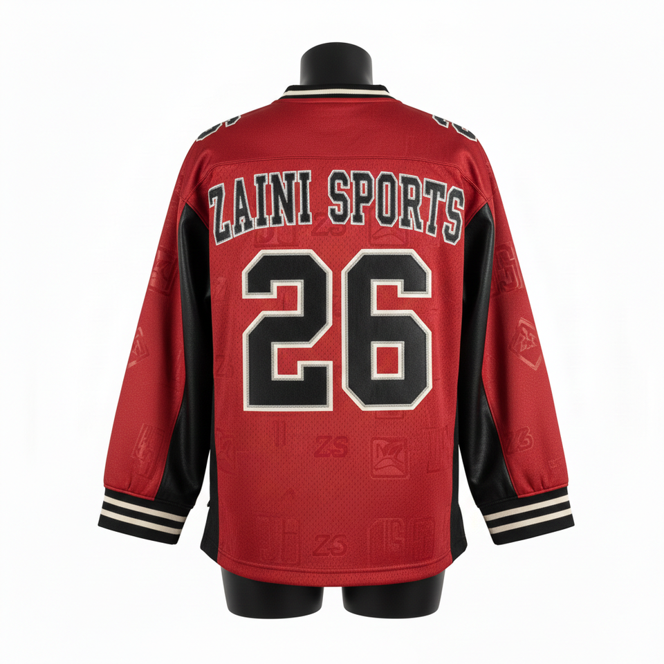 เสื้อฟุตบอลผู้หญิงพรีเมียม ผ้าโพลีเอสเตอร์ตาข่าย 240GSM สีแดงดำ ตัดต่อสีต่างกัน แขนยาว โลโก้ปักแบบ Tackle Twill เสื้อยืดผ้าฝ้ายผู้หญิง