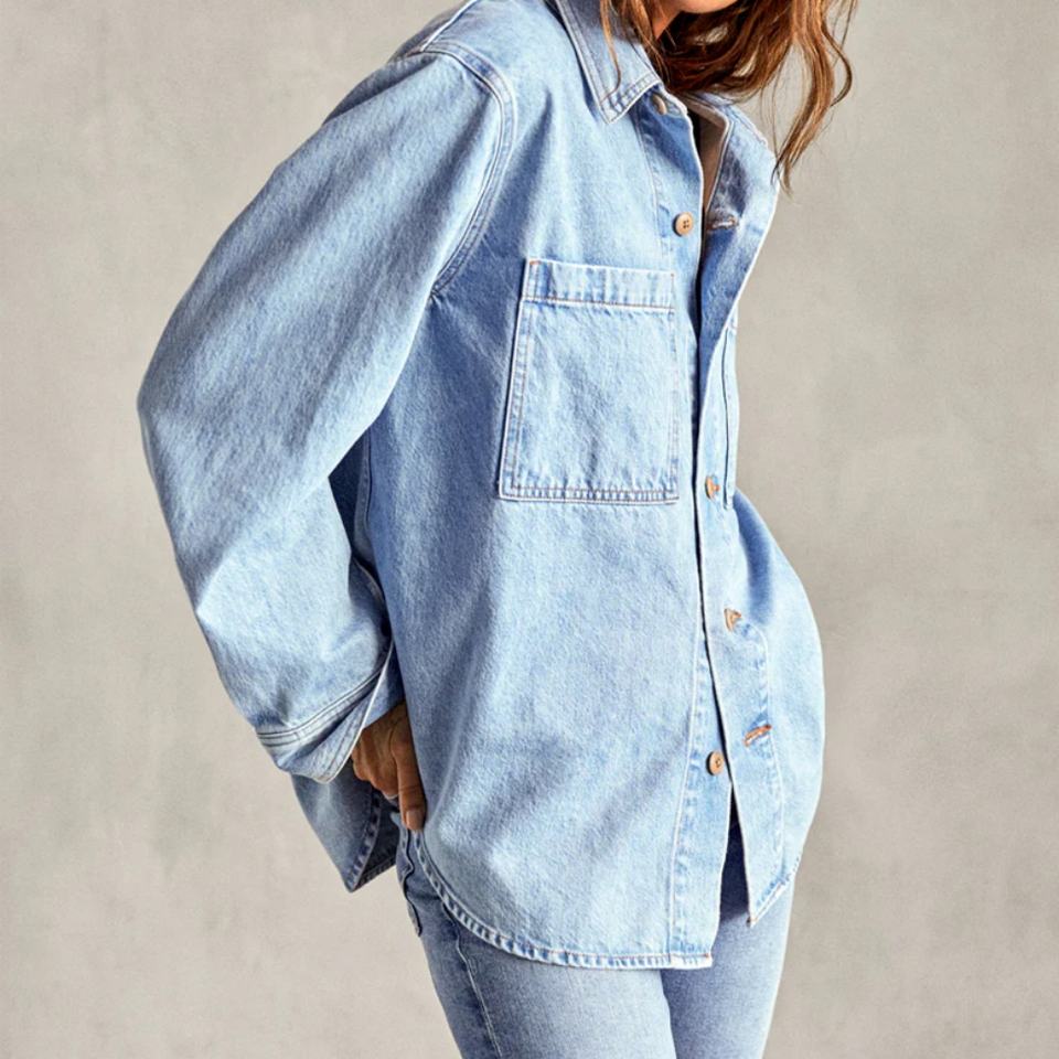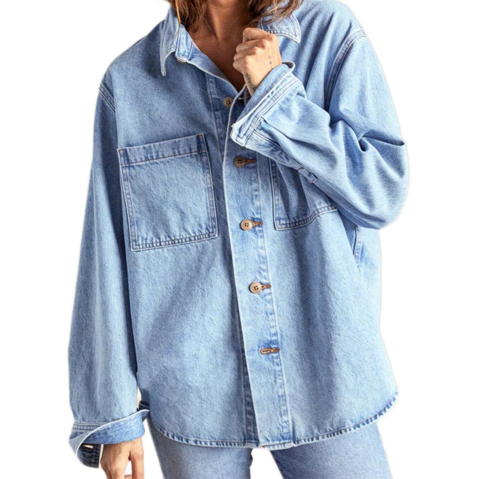 เสื้อเชิ้ตเดนิมทรงโอเวอร์ไซส์ แขนยาว สำหรับผู้หญิง พร้อมปกเสื้อแบบคลาสสิก ติดกระดุม มีกระเป๋าปะ เสื้อผ้าพรีเมียมสำหรับผู้หญิง