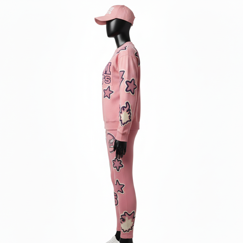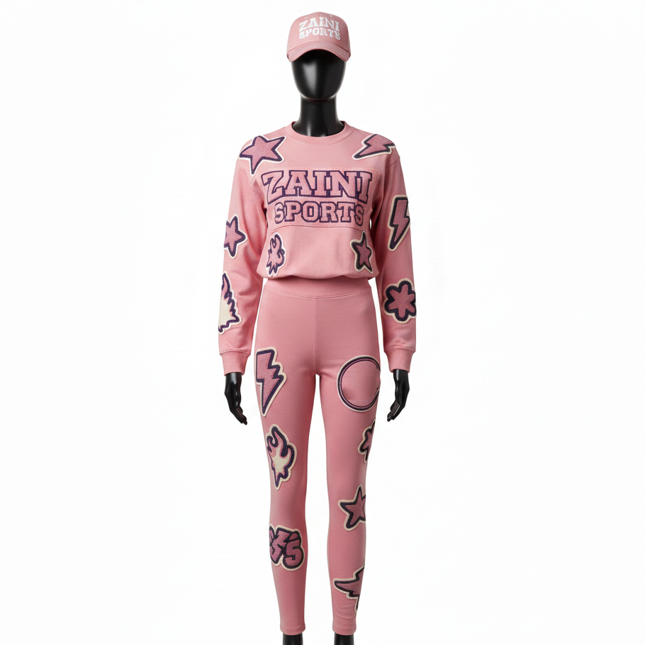 ชุดเสื้อและเลกกิ้งผ้าฝ้ายพรีเมียมสำหรับผู้หญิง 280 GSM สีชมพูอ่อน ปักลายปักอัพพลิเค พร้อมโลโก้สั่งทำพิเศษ