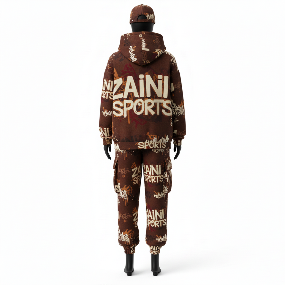 ชุดวอร์มผู้หญิงผ้าฟลีซพรีเมียม 300GSM ผ้าฝ้ายผสมโพลีเอสเตอร์เนื้อนุ่มพิมพ์ลายสีน้ำตาลทั้งตัว รับสกรีนโลโก้ ชุดวอร์มไซส์ใหญ่