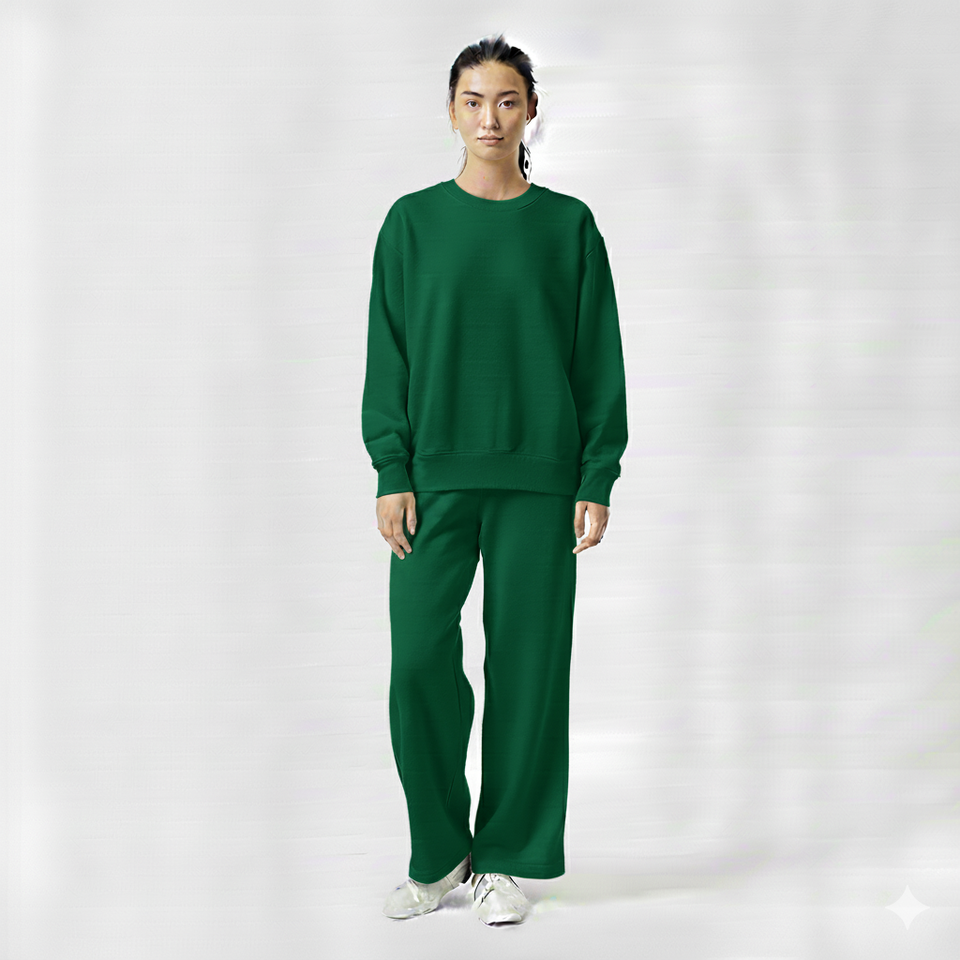 ชุดเสื้อสเวตเชิ้ตโอเวอร์ไซส์พรีเมียมสำหรับผู้หญิงและกางเกงขายาวทรงกว้าง ผลิตจากผ้าโพลีเอสเตอร์/คอตตอนผสม นุ่มสบาย เหมาะสำหรับฤดูหนาว รับสกรีนโลโก้ ใส่สบาย เป็นมิตรกับสิ่งแวดล้อม