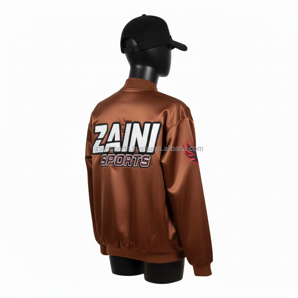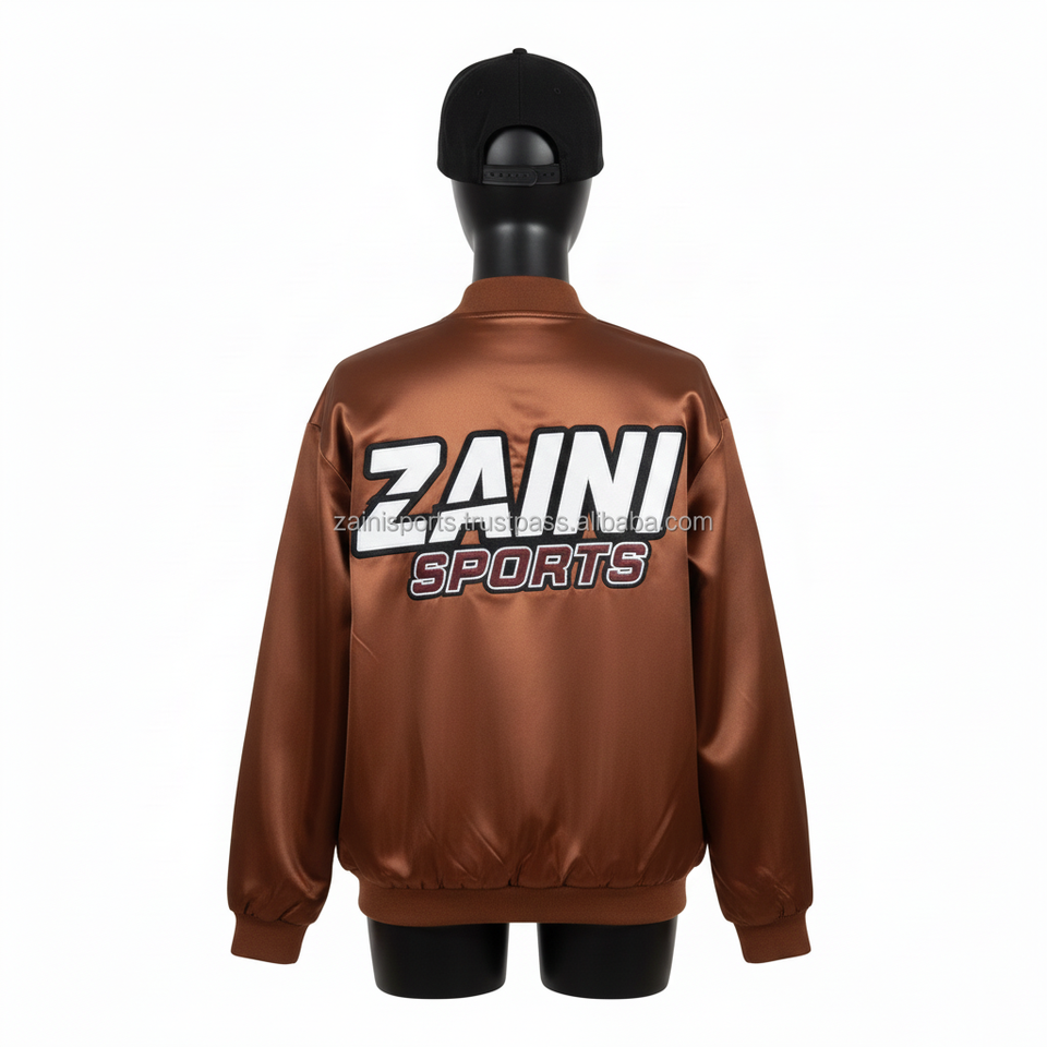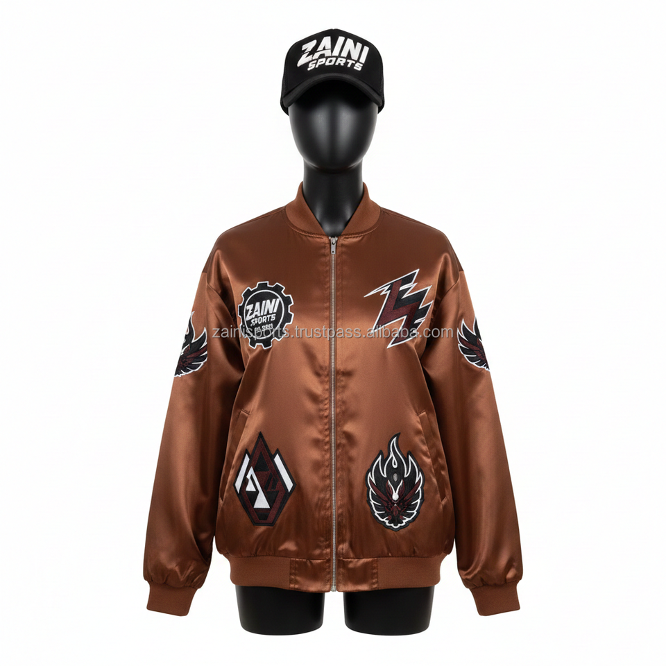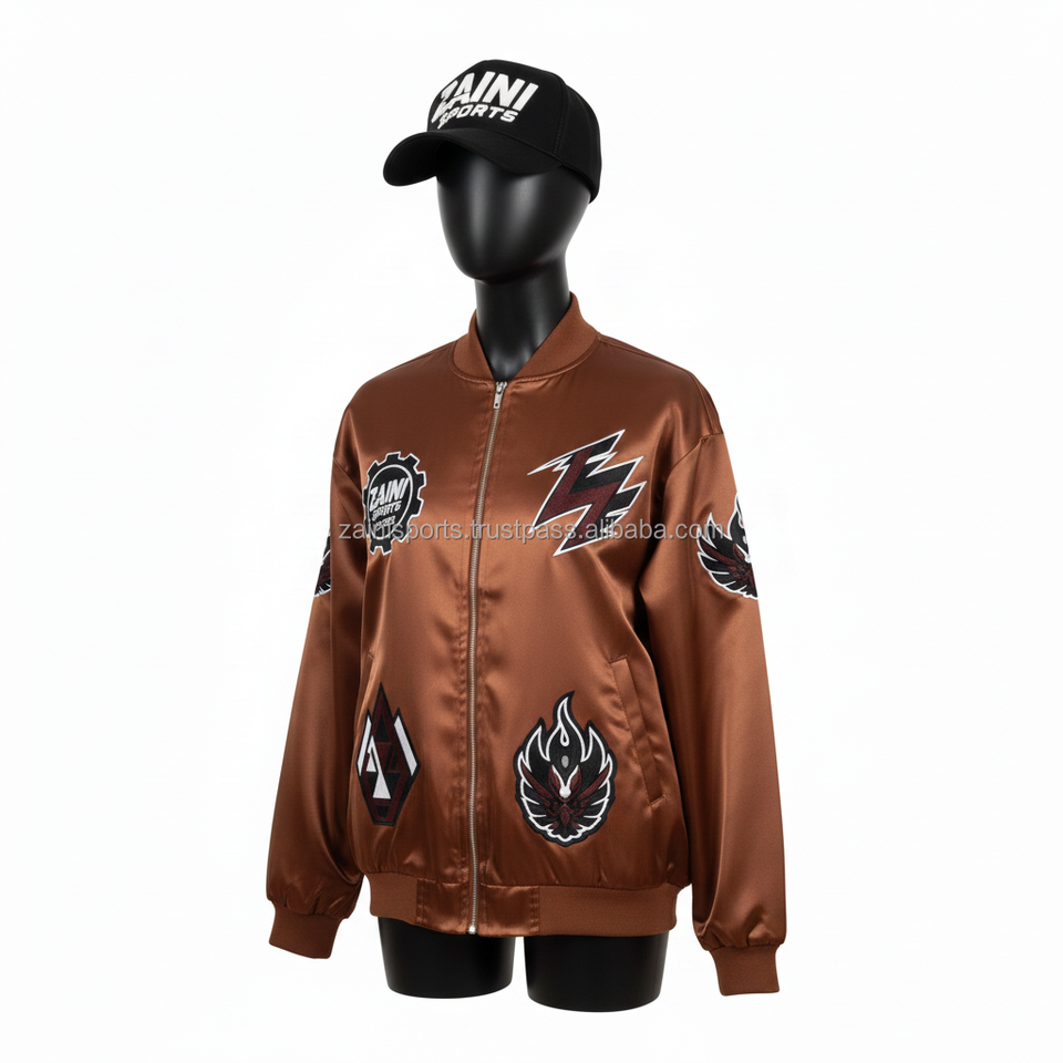 แจ็กเก็ตผ้าซาตินสำหรับผู้หญิงแจ็กเก็ตผ้าซาตินสีน้ำตาลมันวาวติดโลโก้บอมเบอร์ออกแบบได้ตามต้องการ