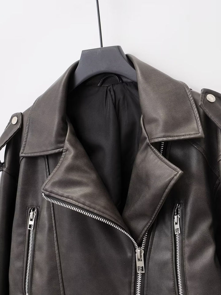 เสื้อแจ็คเก็ตแขนยาวมีซิปปกสำหรับผู้หญิงเสื้อผ้าฤดูใบไม้ผลิฤดูใบไม้ร่วงเสื้อโค้ทหนัง PU แนวสตรีทเสื้อแจ็คเก็ตหนังสำหรับขี่มอเตอร์ไซค์