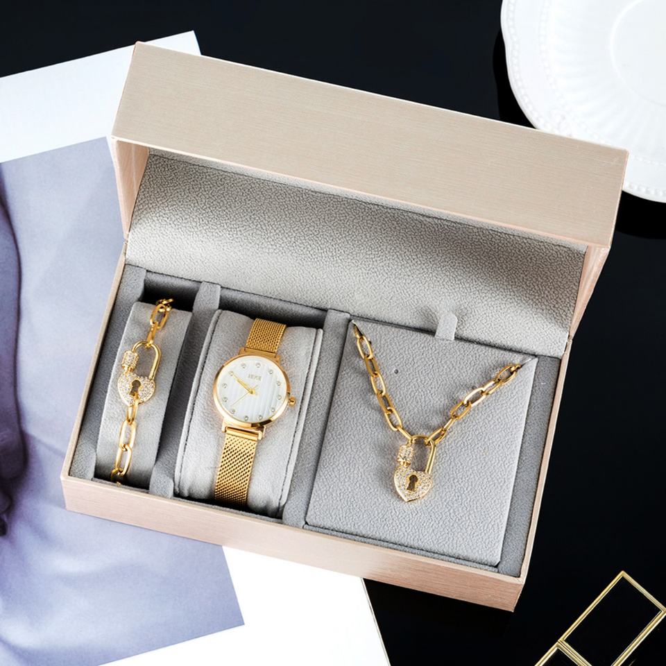นาฬิกาควอตซ์ผู้หญิง สร้อยข้อมือ ชุดสร้อยคอ โทนสีทอง สายตาข่าย จี้รูปแม่กุญแจ สายแบบคลิปหนีบกระดาษ กล่องของขวัญ กันน้ำ คริสต์มาส
