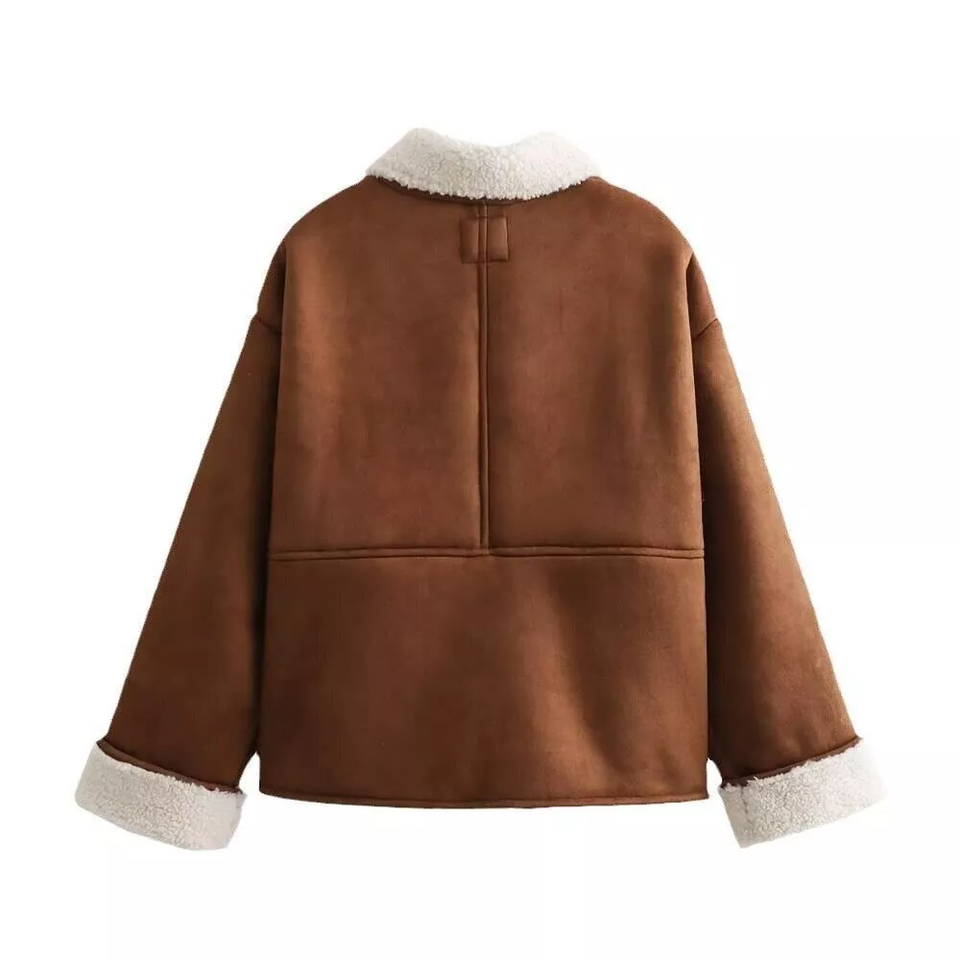 เสื้อโค้ทหนังแกะแท้สำหรับผู้หญิง แต่งขนแกะ ปกเสื้อแบบปกเชิ้ต ทรงหลวม กระดุมแถวเดียว หนานุ่ม ตัดต่อผ้ากำมะหยี่ แจ็คเก็ตหนังกลับทรงหลวม
