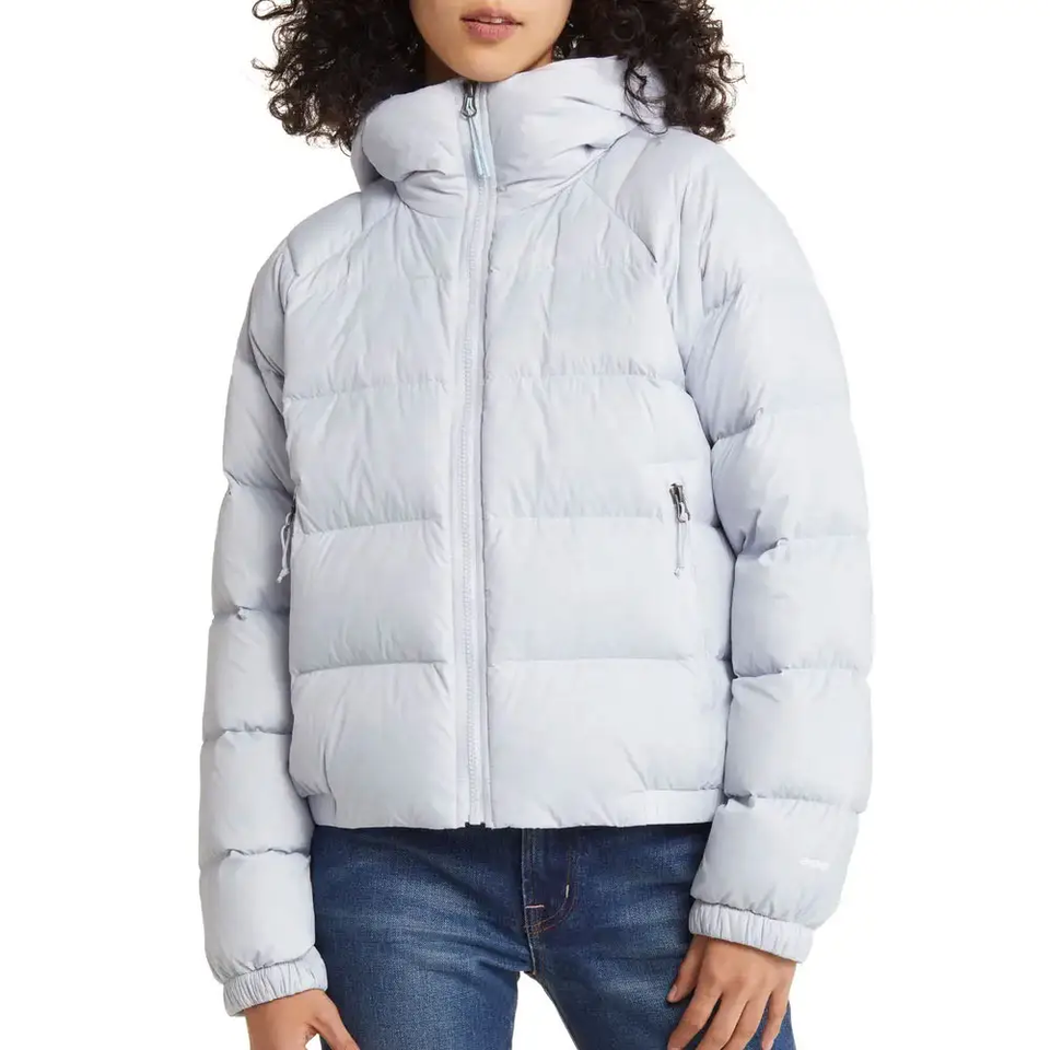 แจ็กเก็ตขนเป็ดโพลีเอสเตอร์รีไซเคิลสำหรับผู้หญิงเสื้อคลุมกันหนาวบุสองชั้นให้ความอบอุ่นเป็นมิตรกับสิ่งแวดล้อม
