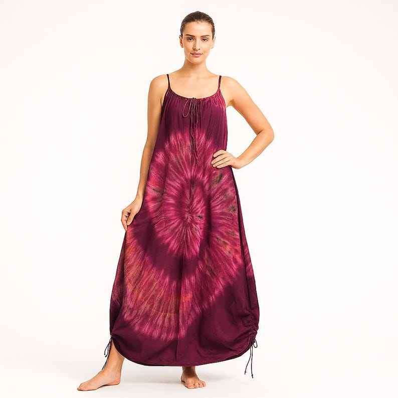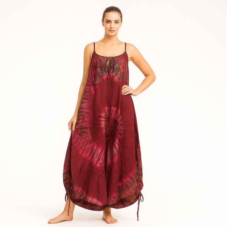 เดรสยาวทรงเอไลน์ผ้าวิสโคสสีแดงลายมัดย้อมแบบเป็นมิตรต่อสิ่งแวดล้อม ซักได้ ระบายอากาศดี สายเดี่ยว แขนสั้น สไตล์โบฮีเมียน สำหรับฤดูร้อน