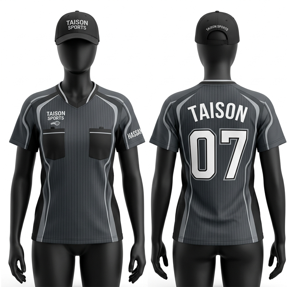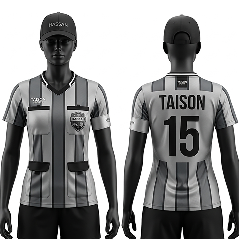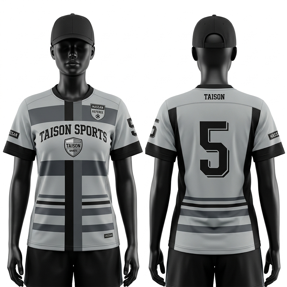 เสื้อกรรมการหญิง ผ้าโพลีเอสเตอร์อินเตอร์ล็อคคุณภาพพรีเมียม 160 GSM ระบายอากาศได้ดี แห้งเร็ว สีเทา ดำ ลายแถบ รับสกรีนโลโก้