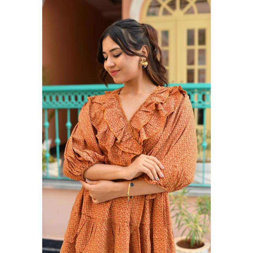 เดรสสั้นผู้หญิงแบบมีระบายหลายชั้น แขนพอง ทรงพันรอบเอว ลายพิมพ์ สำหรับงานปาร์ตี้ฤดูร้อน