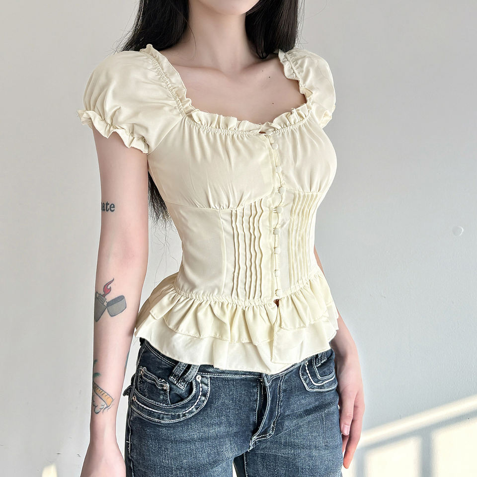 เสื้อยืดผู้หญิงคอเหลี่ยมแต่งระบาย แขนพอง ติดกระดุม ผ้าถัก สีพื้น สไตล์หวาน ใส่ได้ทุกวัน