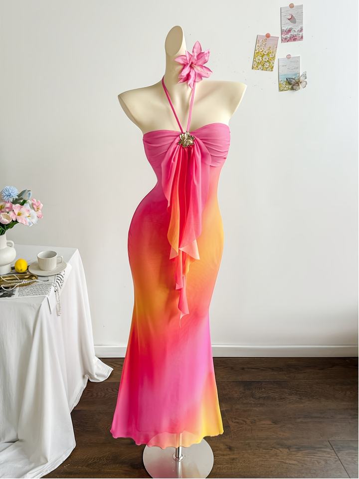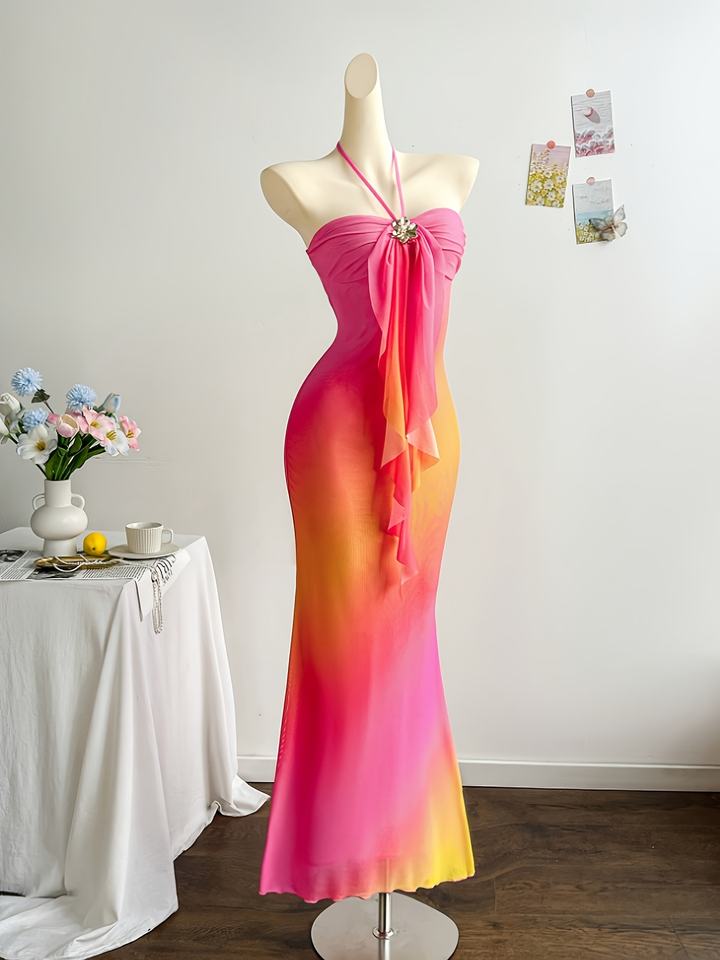 เดรสยาวทรงเข้ารูปสำหรับผู้หญิง สไตล์สตรีทแวร์ฤดูร้อน สีไล่ระดับ ผ้าตาข่าย แต่งระบายโบว์ที่คอ พร้อมดีเทลหัวเข็มขัดโลหะ