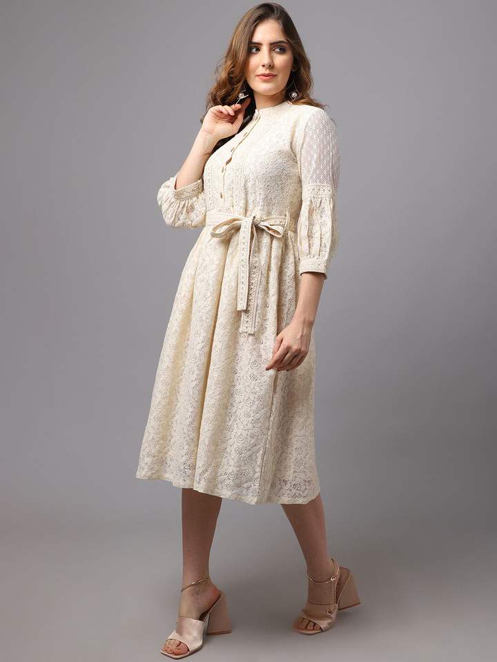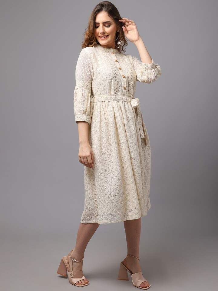 เดรส schiffli MIDI ของผู้หญิงพร้อมผ้าลูกไม้ใส่ได้พอดีและชายบาน
