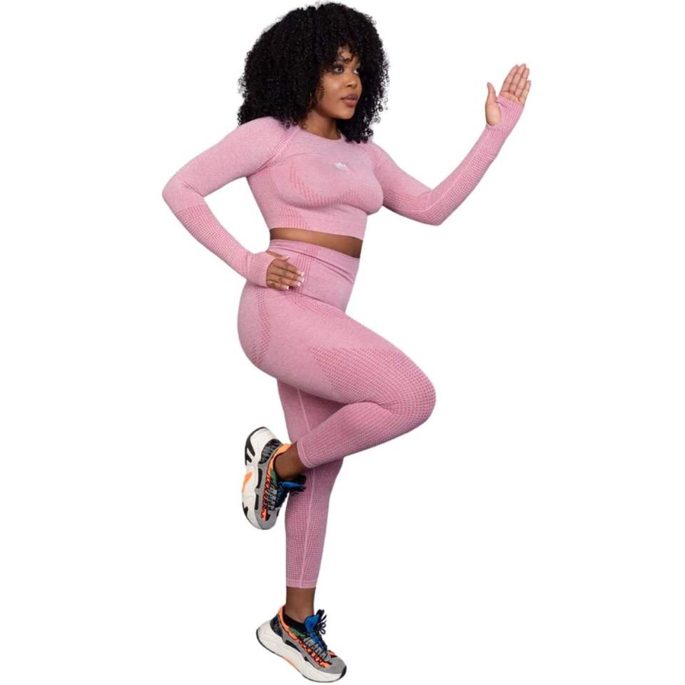ชุดออกกำลังกายสำหรับผู้หญิง เสื้อครอปแขนยาวไร้ตะเข็บ และเลกกิ้งเอวสูง