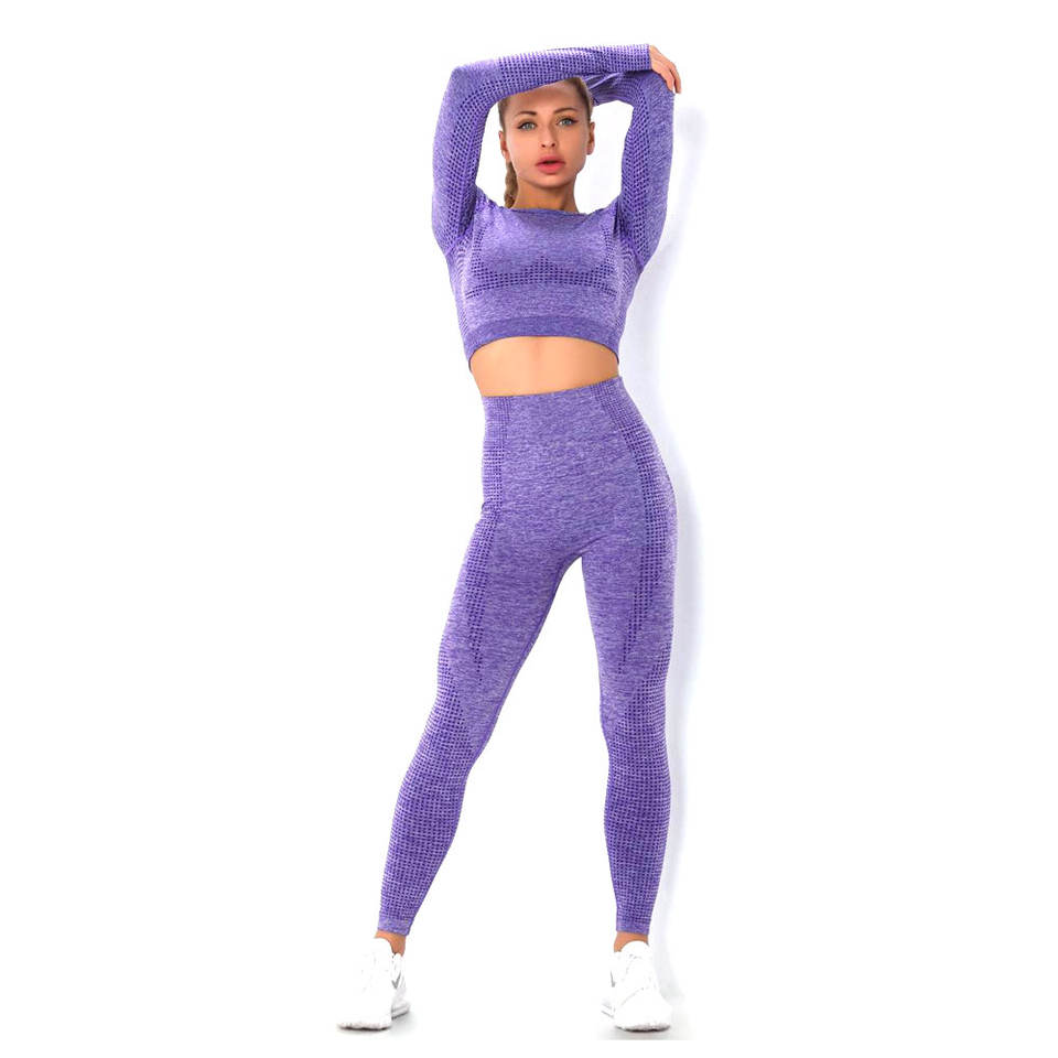 ชุดโยคะไร้รอยต่อสำหรับผู้หญิง เสื้อครอปแขนยาวและเลกกิ้งเอวสูง ชุดออกกำลังกายยืดหยุ่นสำหรับผู้หญิง