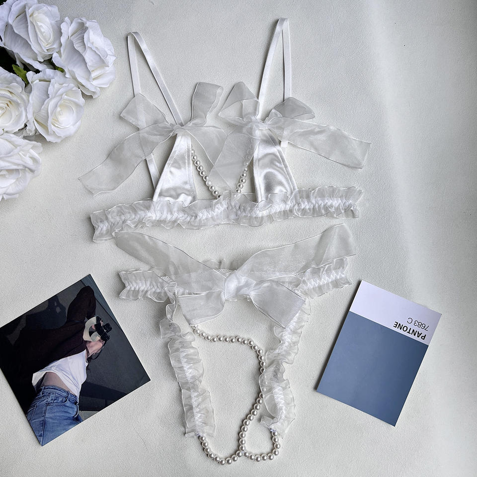 ชุดชั้นในผูกโบว์ประดับมุกสีขาวสุดโรแมนติกสำหรับผู้หญิง