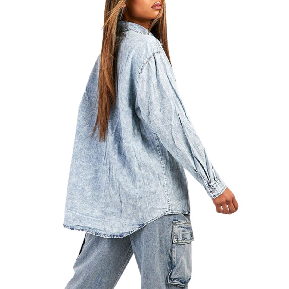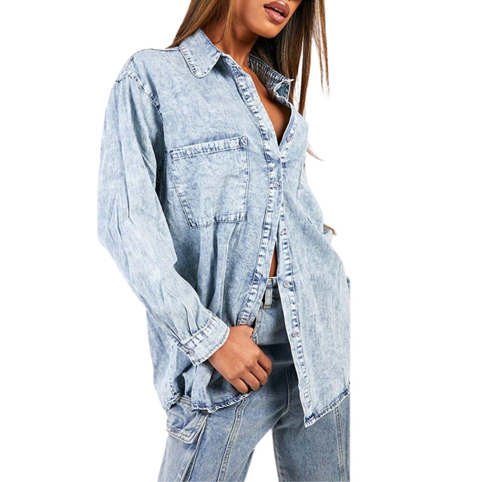 เสื้อผู้หญิงผ้าเดนิมทอเนื้อแน่น คอจีน แขนยาว ทรงปกติ เนื้อผ้านุ่ม เบา สบาย สไตล์เก๋ เหมาะสำหรับงานปาร์ตี้ ฤดูร้อน ผ้า 100% ด้านหน้า