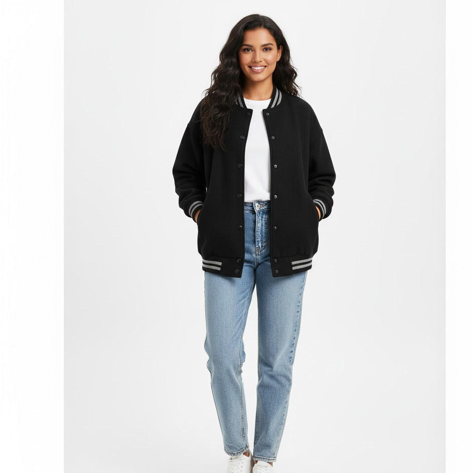 เสื้อแจ็กเก็ตสตรีทแฟชั่นลำลองสไตล์เบสบอลทำตามสั่งเสื้อขนแกะสำหรับผู้หญิง