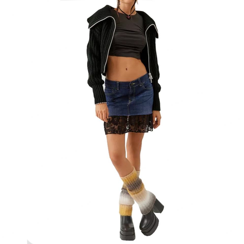 กระโปรงยีนส์สั้นแฟชั่นสำหรับผู้หญิง แต่งขอบลูกไม้ตัดกัน เอวต่ำ สีน้ำเงิน