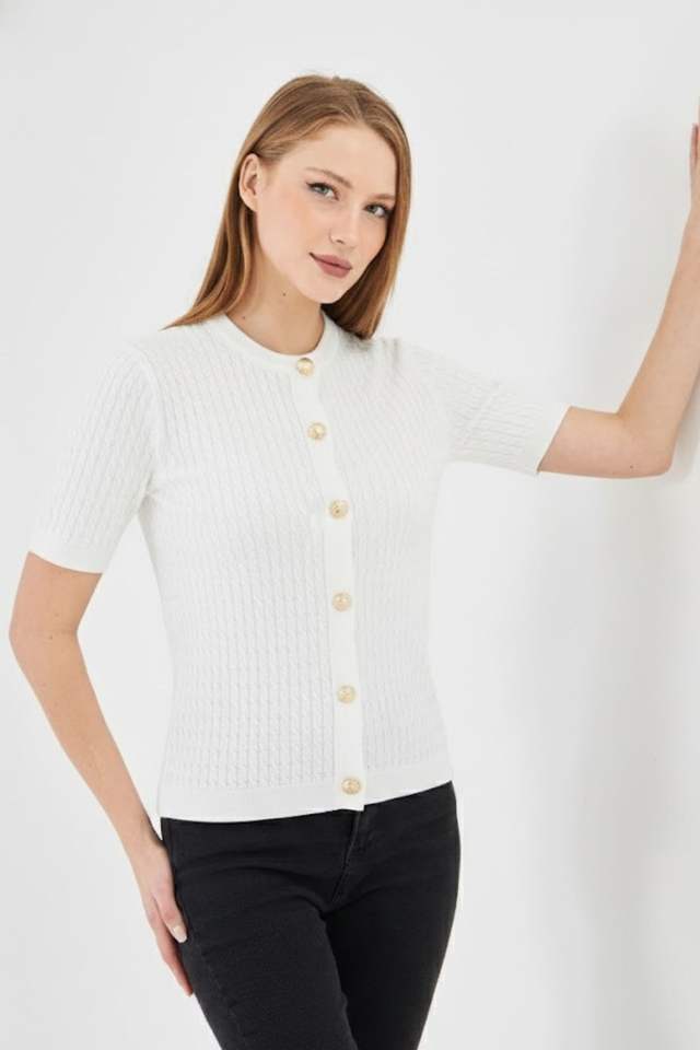เสื้อคาร์ดิแกนแขนสั้นผู้หญิง ดีไซน์หรูหรา สวมใส่สบาย ระบายอากาศได้ดี ผ้าถักลายริบ ทรงเข้ารูป ติดกระดุม เสื้อถักสำหรับฤดูร้อน ทันสมัยสำหรับสุภาพสตรี