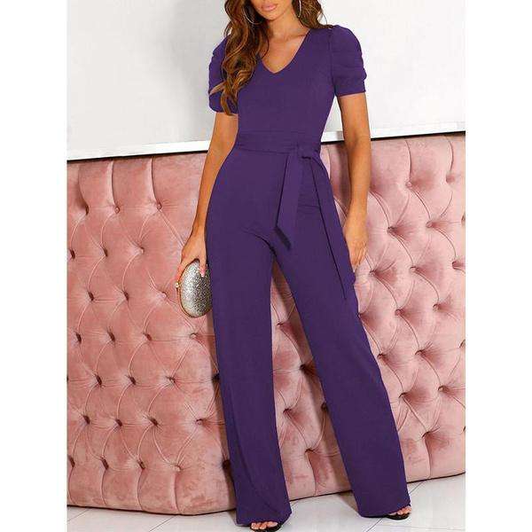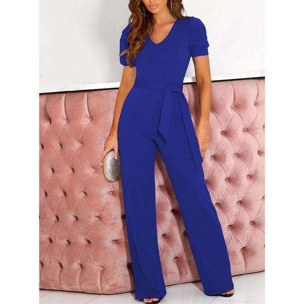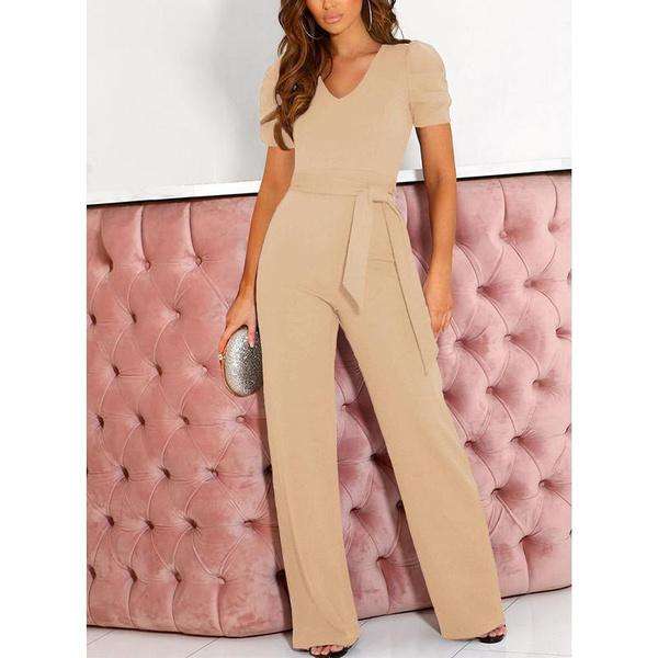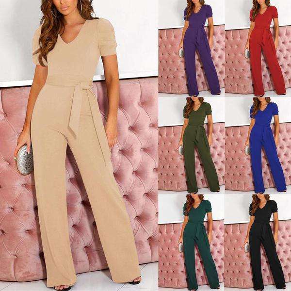จั๊มสูทเอวสูงคอวีแขนสั้นของผู้หญิงกางเกงลำลองขากว้างคาด2025