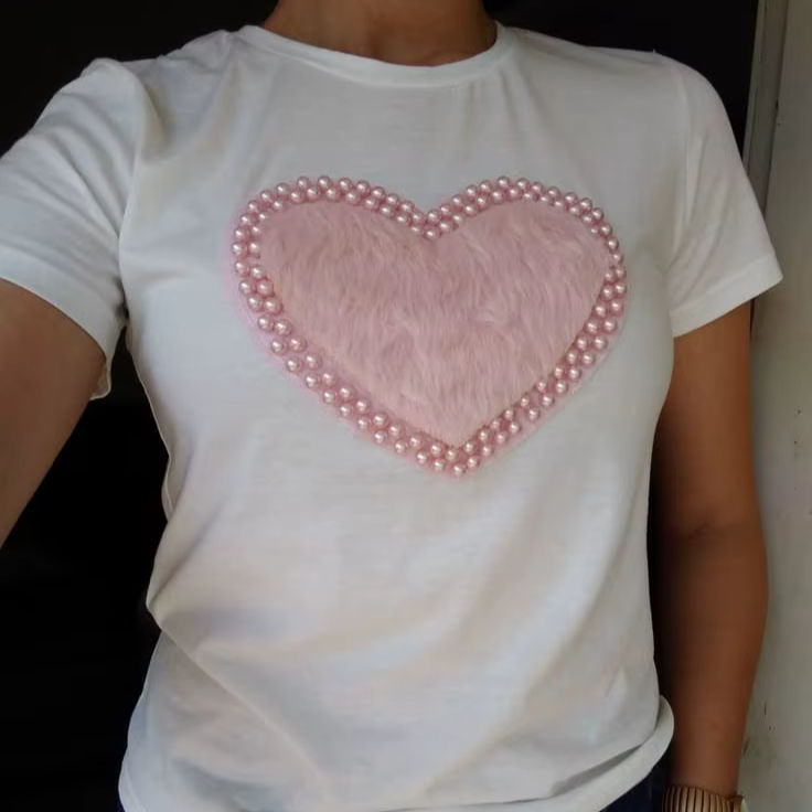 เสื้อยืดแขนสั้นสีขาวผ้าฝ้ายสำหรับผู้หญิง ตกแต่งด้วยขนเฟอร์สีชมพูรูปหัวใจประดับมุก คอเสื้อแบบคอกลม สไตล์ลำลอง เหมาะสำหรับเสื้อผ้าฤดูร้อน
