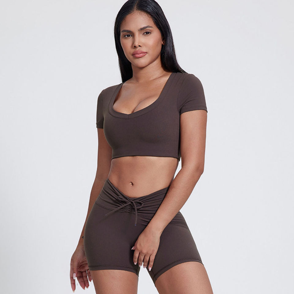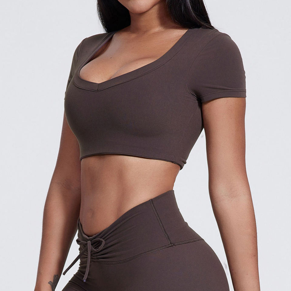 เสื้อครอปโยคะแขนสั้นสำหรับผู้หญิง | เสื้อยืดออกกำลังกายลำลองคอวี | เสื้อยืดออกกำลังกายขั้นพื้นฐานน่ารัก