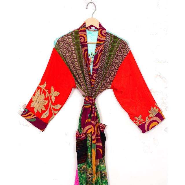 ชุดกิโมโนผ้าไหมปะติดปะต่อแบบหรูหราสำหรับผู้หญิง คอวี ผูกเชือก มีกระเป๋า 2 ช่อง สไตล์อินเดีย ทำจากผ้าซารีรีไซเคิล สไตล์โบฮีเมียน ชุดเจ้าสาวแบบยาว