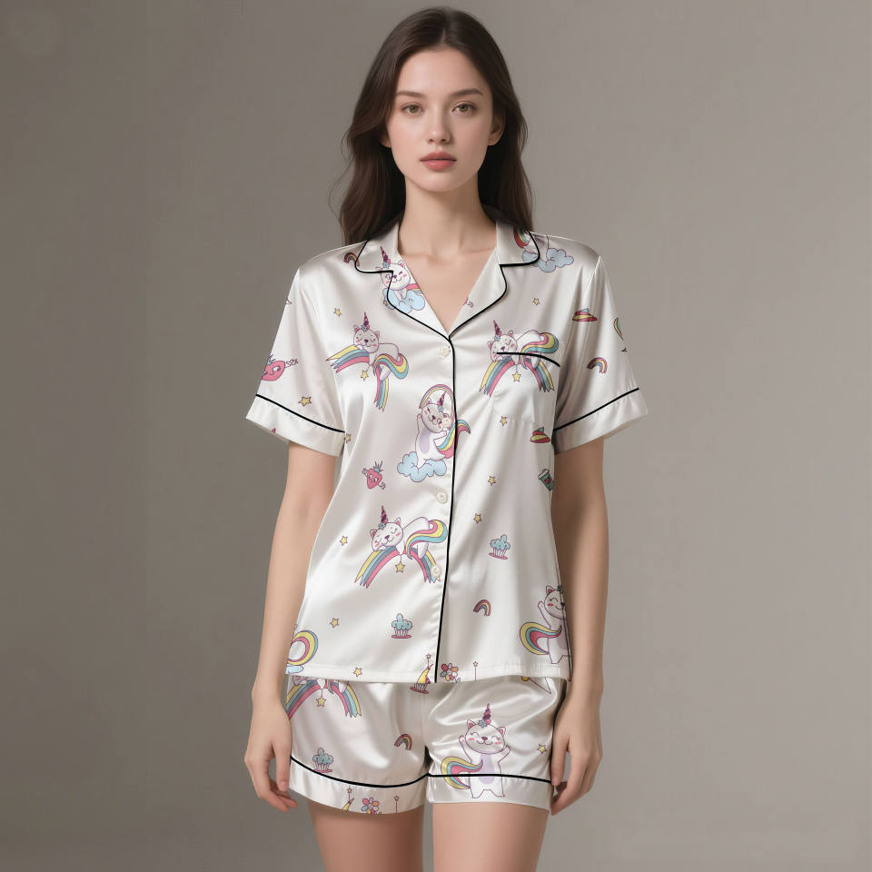 ชุดนอนผ้าไหมซาตินสำหรับผู้หญิง ออกแบบ OEM แขนสั้น ระบายอากาศดี เหมาะสำหรับฤดูใบไม้ผลิและฤดูร้อน แบบสองชิ้น