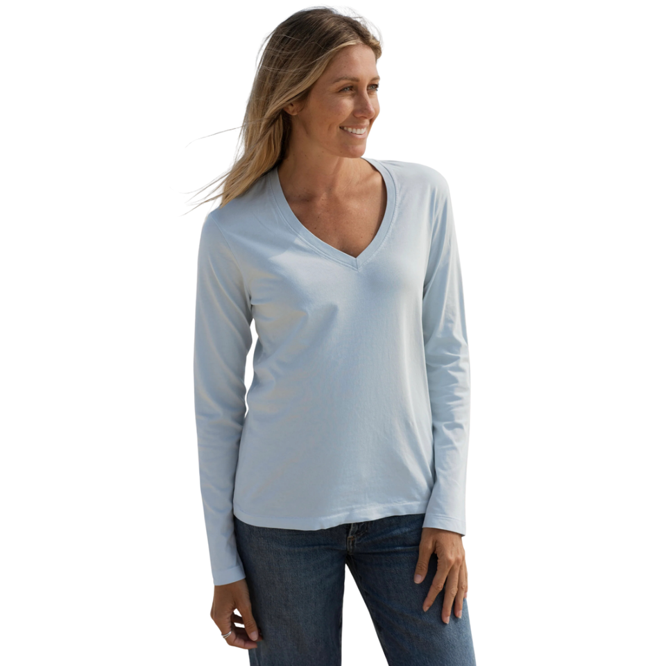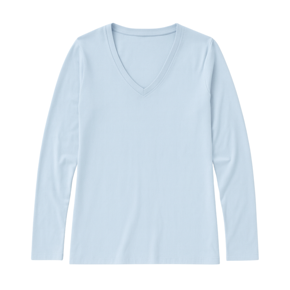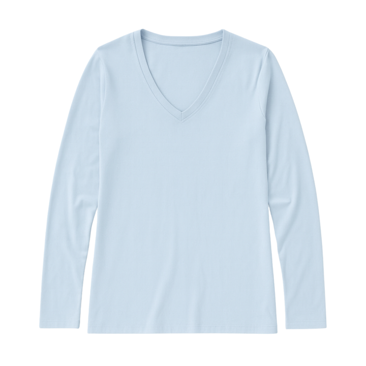 เสื้อยืดผู้หญิงสีฟ้าอ่อน แขนยาว คอวี ผ้าฝ้ายออร์แกนิค 100% คุณภาพพรีเมียม ผ่านการรับรอง GOTS ผ้าเนื้อนุ่มพิเศษ ทรงคลาสสิก