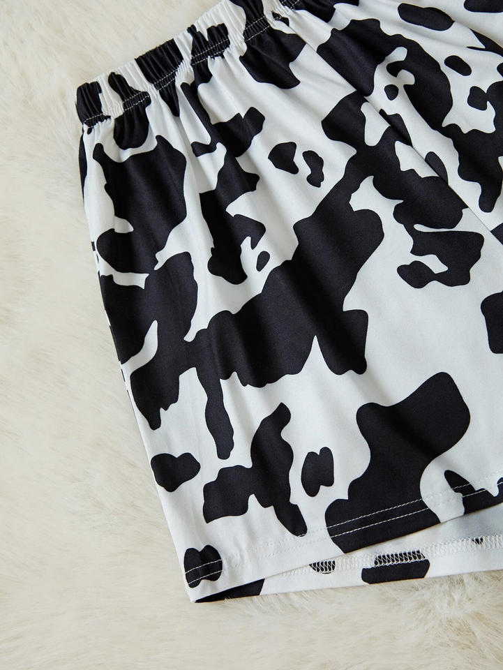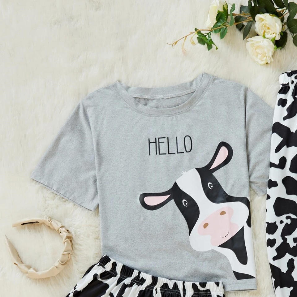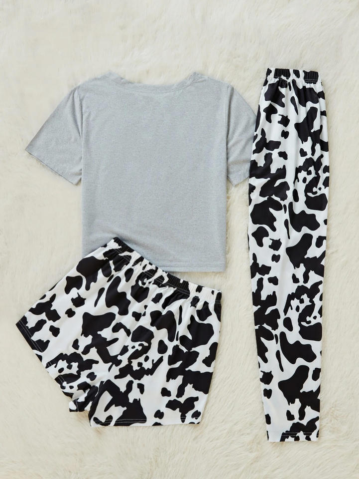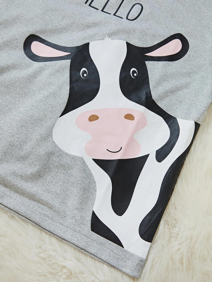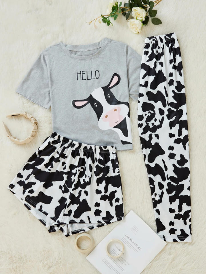 ชุดนอนชุดนอนกางเกงเอวและกางเกงขาสั้นสำหรับผู้หญิงเสื้อยืดกราฟิกพิมพ์ลายควายและกางเกงขาสั้นสำหรับผู้หญิง