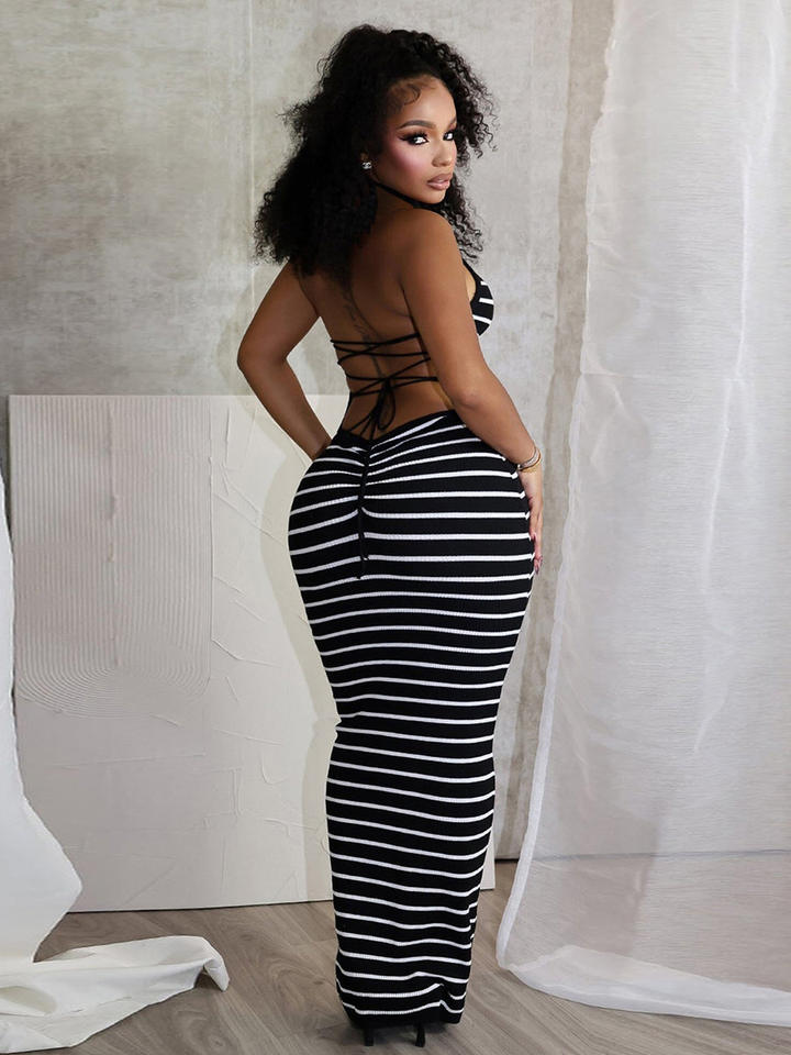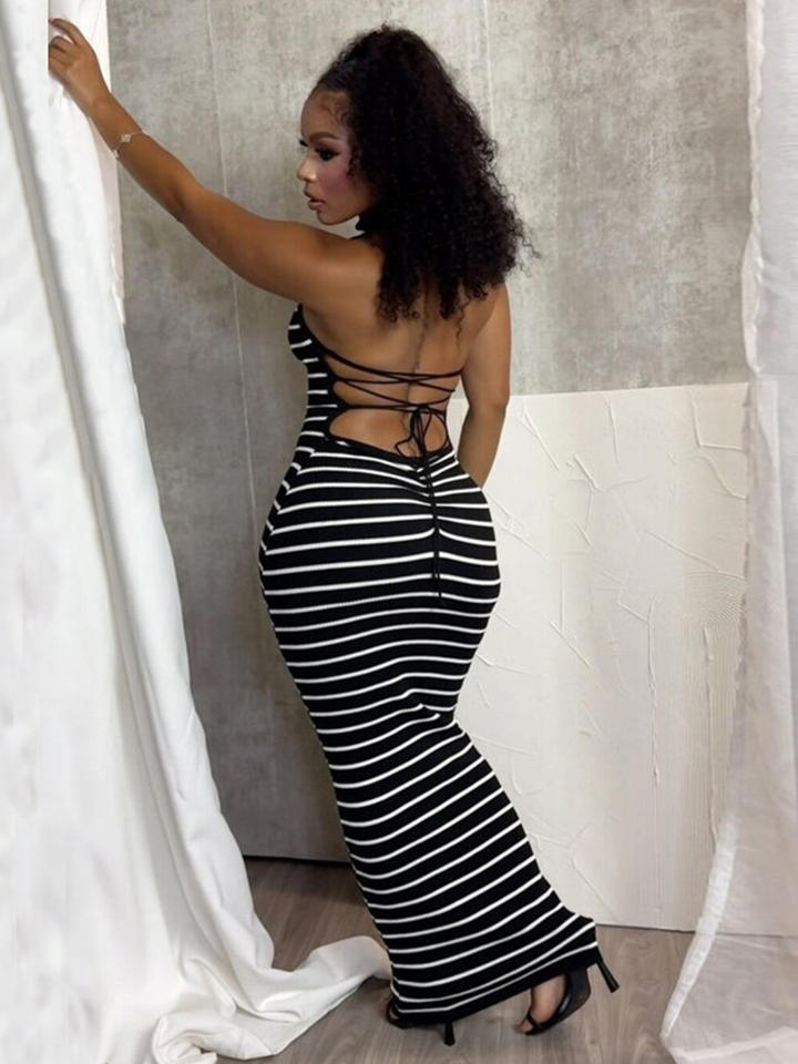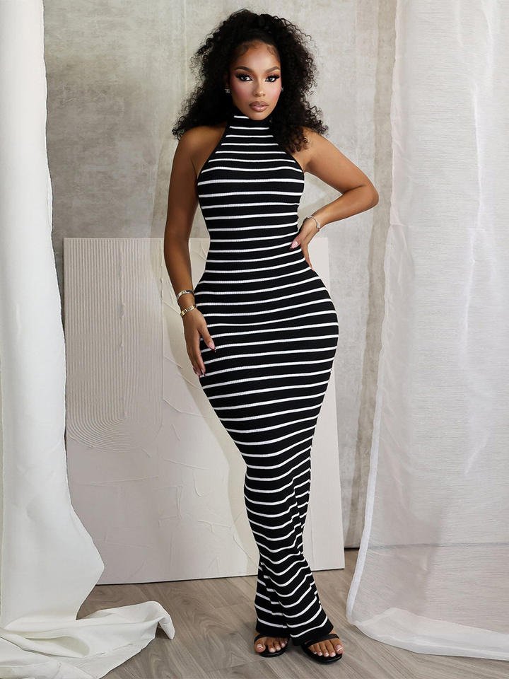 เดรสยาวลายทางสำหรับผู้หญิง แขนกุด คอทรงโอ เปิดหลัง เอวสูง ระบายอากาศดี เหมาะสำหรับงานปาร์ตี้กลางคืน สไตล์เซ็กซี่ ใส่ได้ในฤดูร้อน