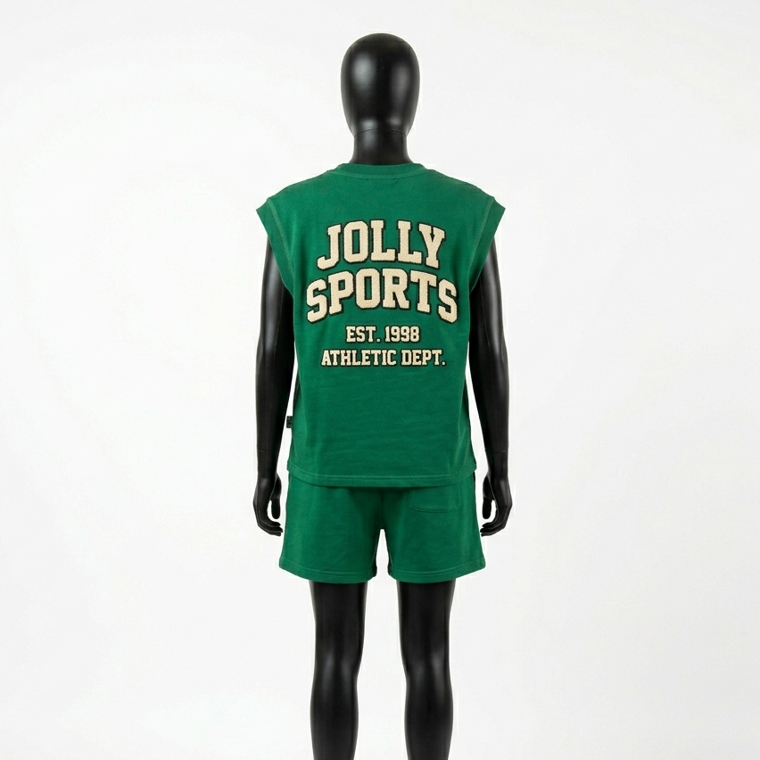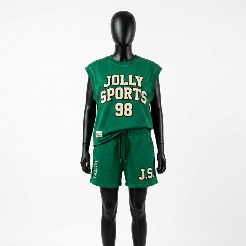 ชุดเสื้อยืดแขนกุดและกางเกงขาสั้นสำหรับผู้หญิง ผ้าฝ้ายพรีเมียม 280 GSM ผ้าเฟรนช์เทอร์รี่ พิมพ์ลายโลโก้สีเขียว ชุดเซ็ตสำหรับผู้หญิง