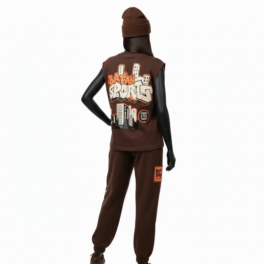 ชุดเสื้อยืดแขนกุดและกางเกงขายาวสำหรับผู้หญิง ผ้าฝ้ายผสมโพลีเอสเตอร์เนื้อฟลีซสีน้ำตาล แต่งแผ่นผ้าตัดต่อสีตัดกัน พิมพ์โลโก้ตามสั่ง ชุดสำหรับผู้หญิง