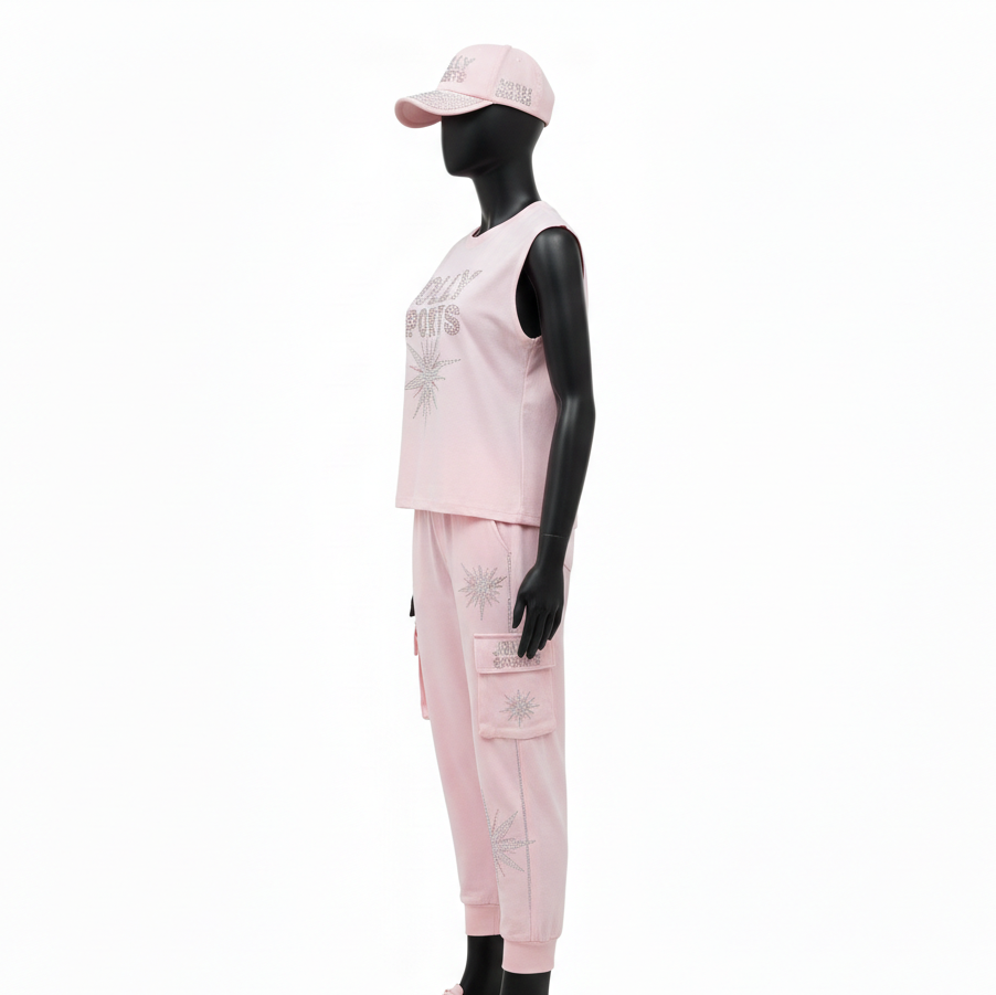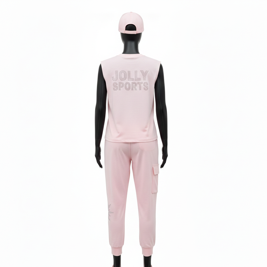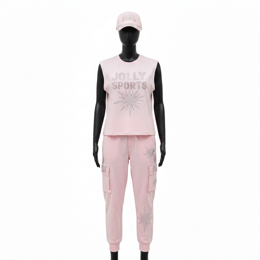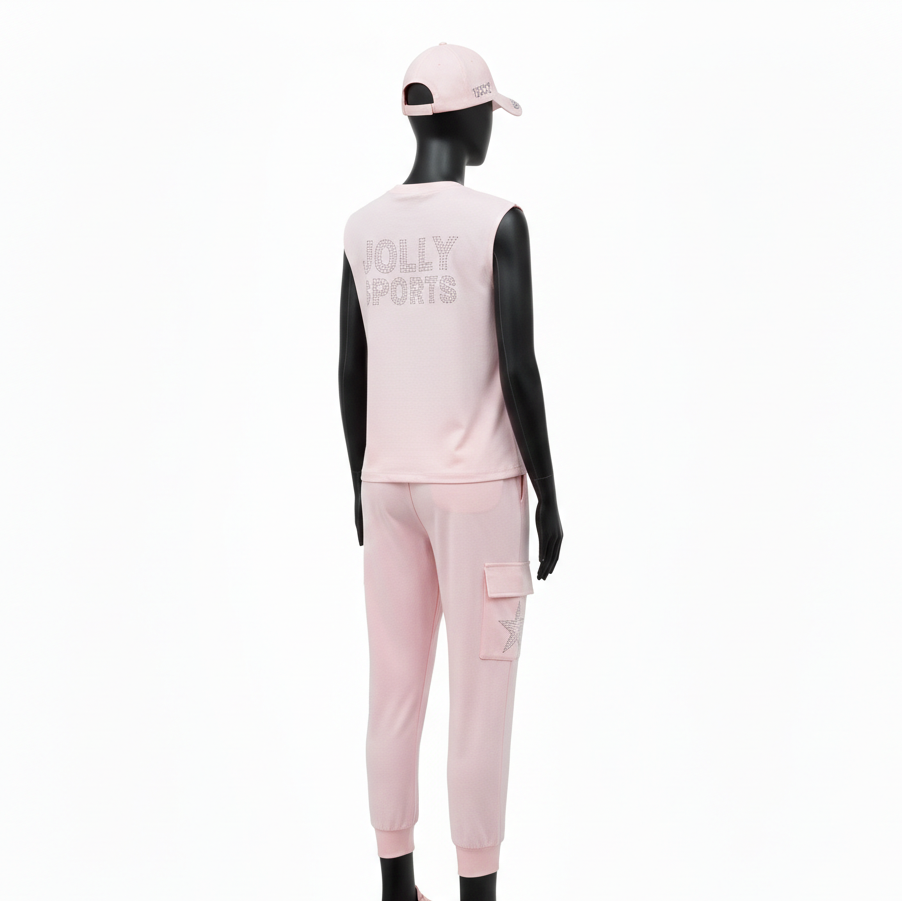 เสื้อยืดแขนกุดผู้หญิง ชุดสองชิ้น ผ้าคอตตอนผสม GSM สูง สีชมพูพาสเทล ประดับคริสตัลแบบ Hotfix โลโก้สั่งทำ ชุดผู้หญิง