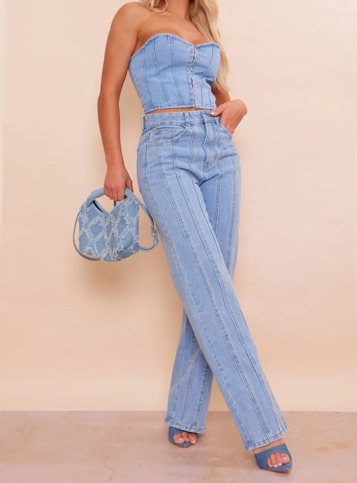 เสื้อแขนกุด & กางเกงยีนส์ผู้หญิงชุดครอปยีนส์ทรงตรงสองชิ้นเอวลอยทรงสูง