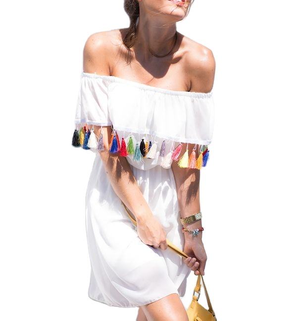 ชุดเดรสสีขาวมีพู่ปิดไหล่สไตล์โบโฮสำหรับผู้หญิง,เสื้อคลุมหรูหราสำหรับผู้หญิงใส่ไปงานปาร์ตี้มีพู่