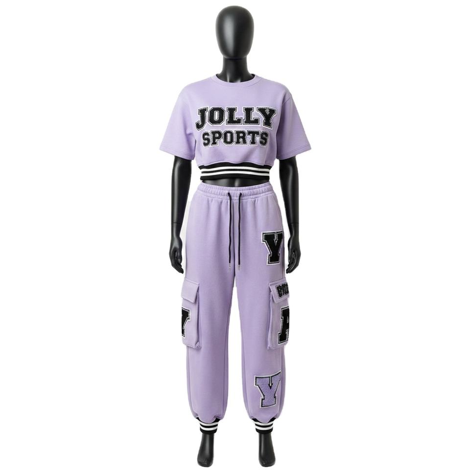ชุดเซ็ตเสื้อครอปท็อปผ้าฟลีซผสมคอตตอนเนื้อนุ่ม 300 GSM สีลาเวนเดอร์ พร้อมกางเกงคาร์โก้เอวยางยืดลายทาง แต่งแพทช์เชนิลล์ สำหรับผู้หญิง