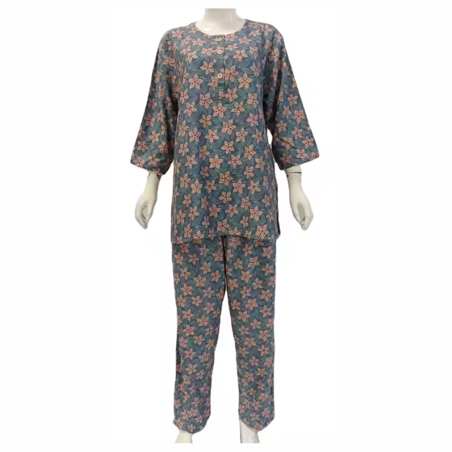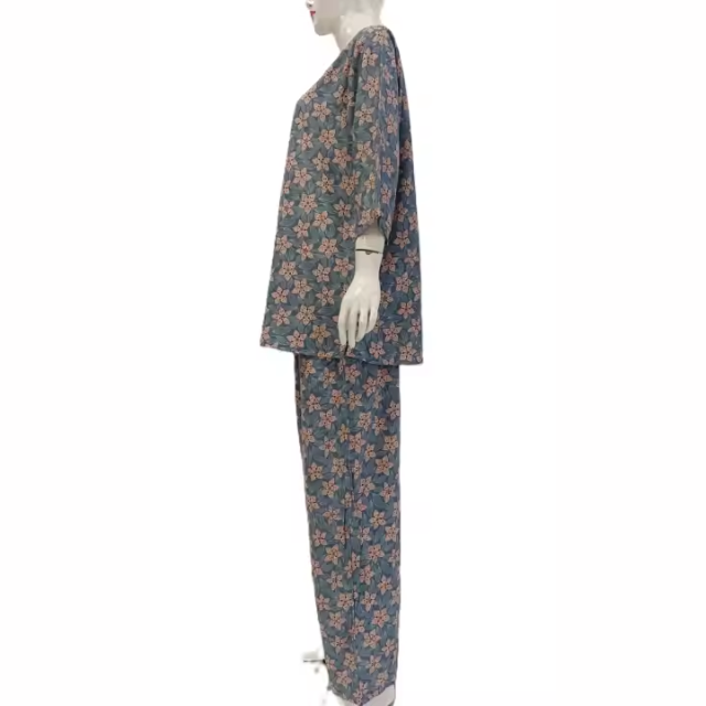 ชุดนอนผ้าเรยอนลายดอกไม้สำหรับผู้หญิง แบรนด์ Chrysanta เสื้อเชิ้ตแขนยาวผูกเชือกและกางเกงขายาว ใส่สบายสำหรับฤดูร้อน