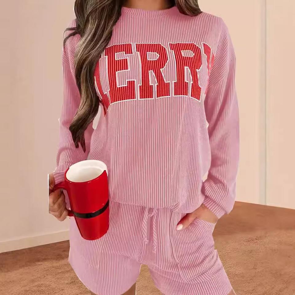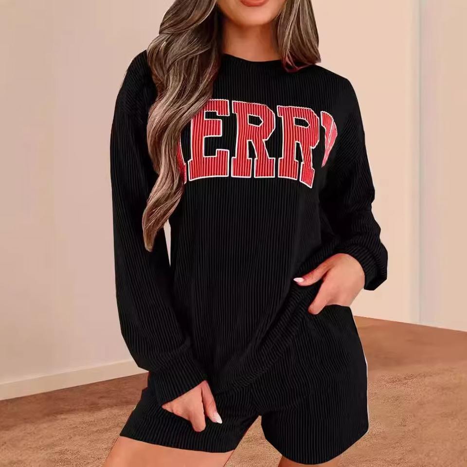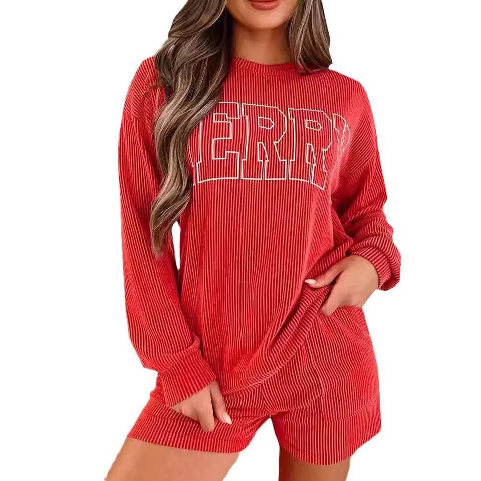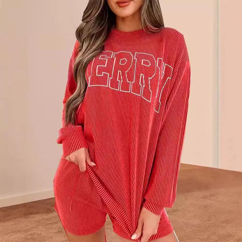 เซ็ตเสื้อสเวตเตอร์และกางเกงขาสั้นสีพื้นเหนือเข่าสำหรับผู้หญิงสองชิ้นลำลองแบบเรียบง่าย